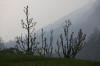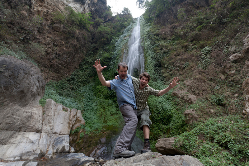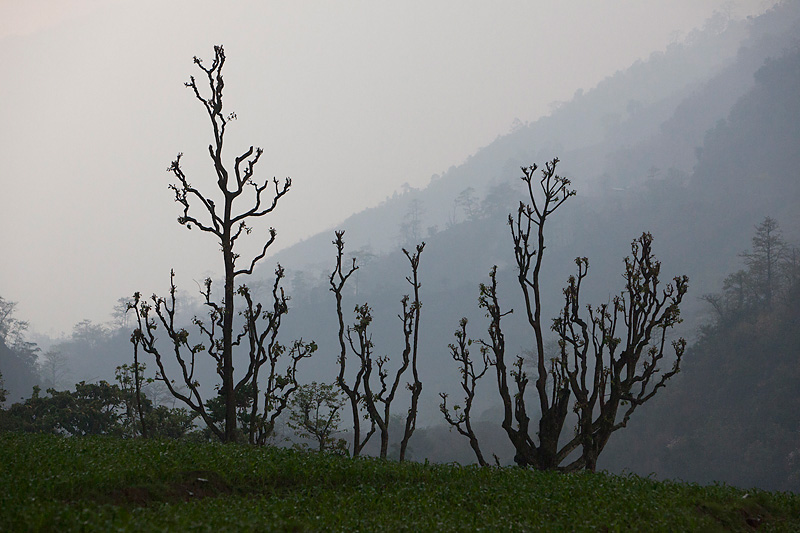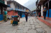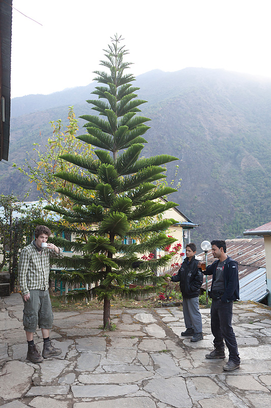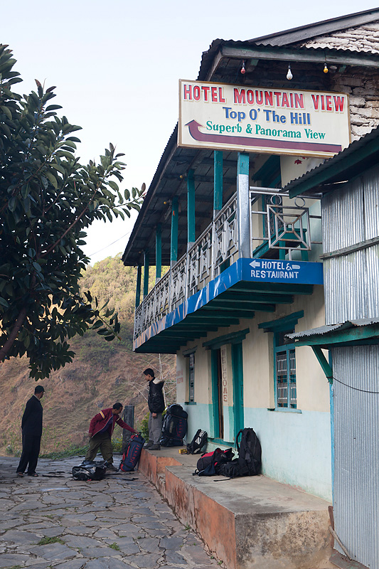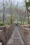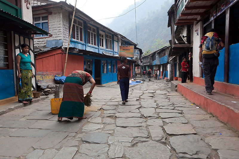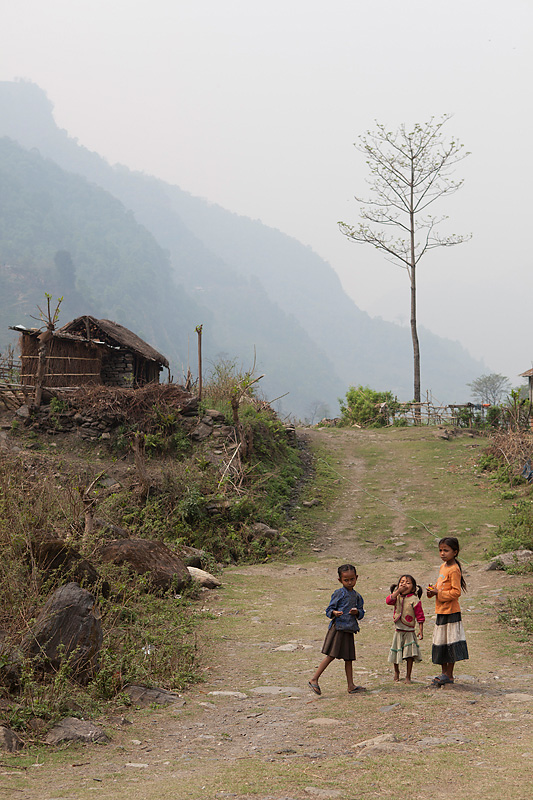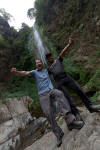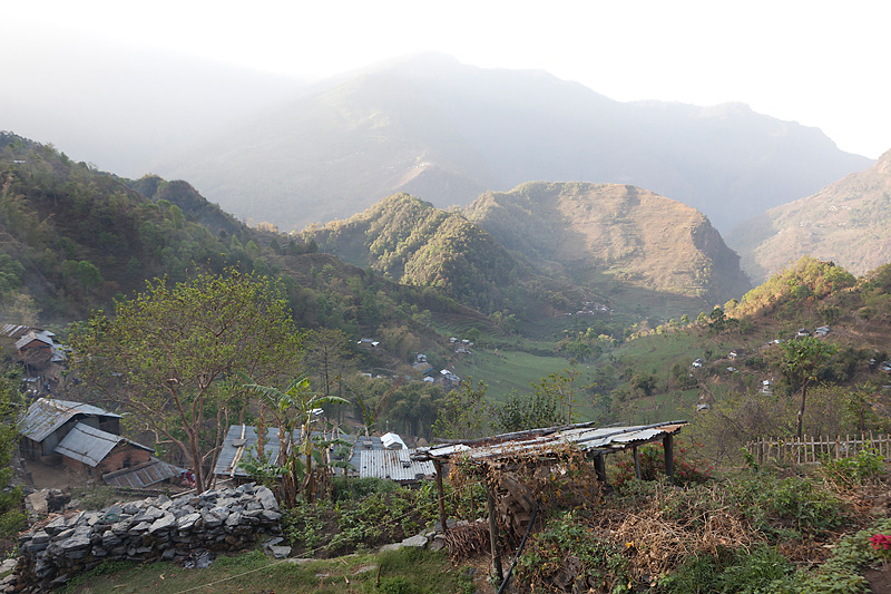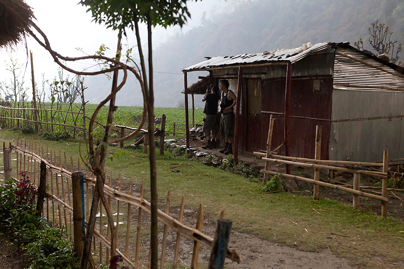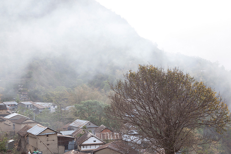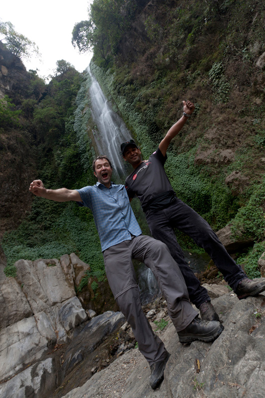 Am nächsten Morgen geht es von Khudi zunächst weiter über die Fahrstrasse bis nach Bhulbhule. Nach einer knappen Stunde haben wir den Ort erreicht. Hier können wir zum Glück die Fahrstrasse verlassen. Über einen kleinen Pfad steigen wir rechts ab zum Fluss und erreichen über die erste Hängebrücke. Eine der zahllosen Überquerungen des Marsyandis auch in den nächsten Tagen. Am Ortsende von Bhulbhule ist ein toller Wasserfall am rechten Wegesrand. Dadurch, dass es hier lange nicht mehr richtig geregnet hat, ist der Wasserfall wohl für seine sonstigen Verhältnisse eher spärlich, wie mein nepalischer Freund Hari, der uns wieder auf der Tour begleitet, erzählt. Trotzdem auch so ein toller Anblick. Weiter geht der Weg vorbei am Marsyandi durch Wiesen und Felder. Gegen Mittag erreichen wir den Ort Nadi Bazar. Ein „Ortsplan“ zeigt uns die „Sehenswürdigkeiten“ des Ortes. Am Ortsende machen wir in einer netten Lodge Rast. Während unserer Pause zieht sich der Himmel zuerst langsam aber dann immer schneller zu. Ganz plötzlich ist es dunkel geworden und es kommt ein fürchterliches Gewitter mit dicken Hagelkörnern runter. Der Lodgebesitzer ist so nett und schließt uns ein Gästezimmer auf, so dass wir uns dort unterstellen können. Über eine Stunde dauert das Gewitter. Der Wasserfall von Bhulbhule hat nun sicherlich eine andere Kraft. Als der Regen nachlässt, entschließen wir uns langsam weiterzugehen. Wir packen unsere Regensachen aus und los geht es. Der Weiterweg ist nun sehr mühsam. Es stehen riesige Wasserlachen auf den Wegen und wir suchen uns mühsam einen einigermaßen trockenen Pfad. Nachdem wir gut unterwegs sind, merken wir, wie das Gewitter wohl zurückkommt. Es blitzt und donnert um uns herum und wir fühlen uns nicht wirklich wohl. Auch der Regen nimmt wieder an Stärke zu. Zunächst am Nadi Kola entlang, dann über eine Hängebrücke kommen wir wieder in einen Bauabschnitt einer Strasse. Hier ist es nun besonders matschig. Immer das Gewitter im Nacken geht es weiter in Richtung Bahundanda. Die tolle Landschaft durch die wir nun kommen, können wir nicht wirklich genießen. Durch tolle Maisterrassen, alles wunderbar grün, führt uns der Weg mal steil mal flach in Richtung Ziel. In einer Rekordzeit von 90 Minuten erreichen wir Bahundanda, das wunderschön auf einem Bergrücken liegt. Bei schönem Wetter soll man von hier einen herrlichen Ausblick auf den Manaslu haben. Wir haben den heute leider nicht. Die nassen Sachen werden ausgezogen und zum trocknen aufgehängt. Kurz darauf bricht das Gewitter erneut mit aller macht los. Wir sind froh, dass wir jetzt nicht mehr draußen unterwegs sind. In der Lodge ist es ruhig. Der Junge der Lodgebesitzer nutzt die Gelegenheit, um sein Englisch zu testen. Und das macht er richtig gut. So verfliegt die Zeit bis zum Abend.