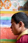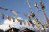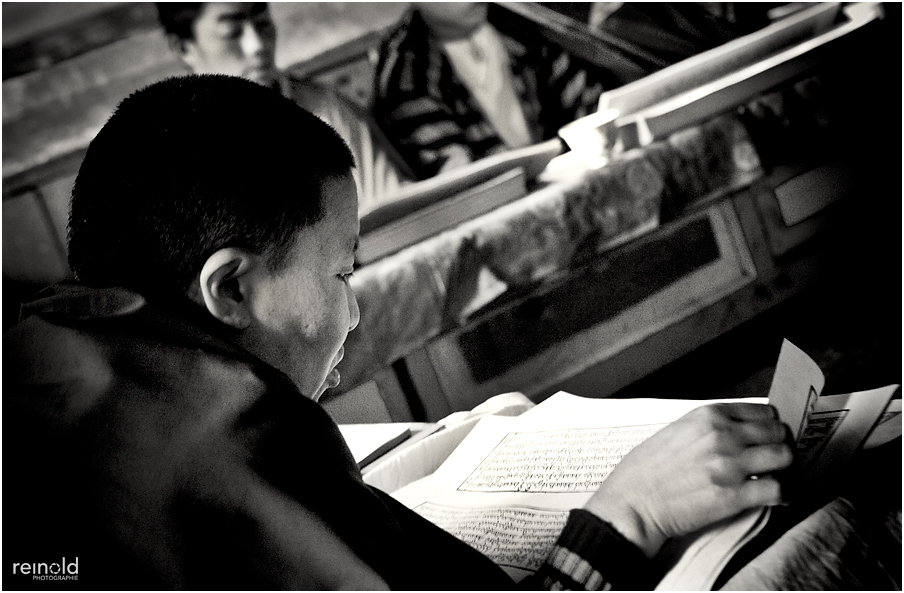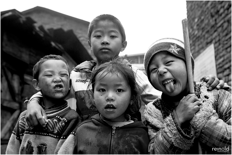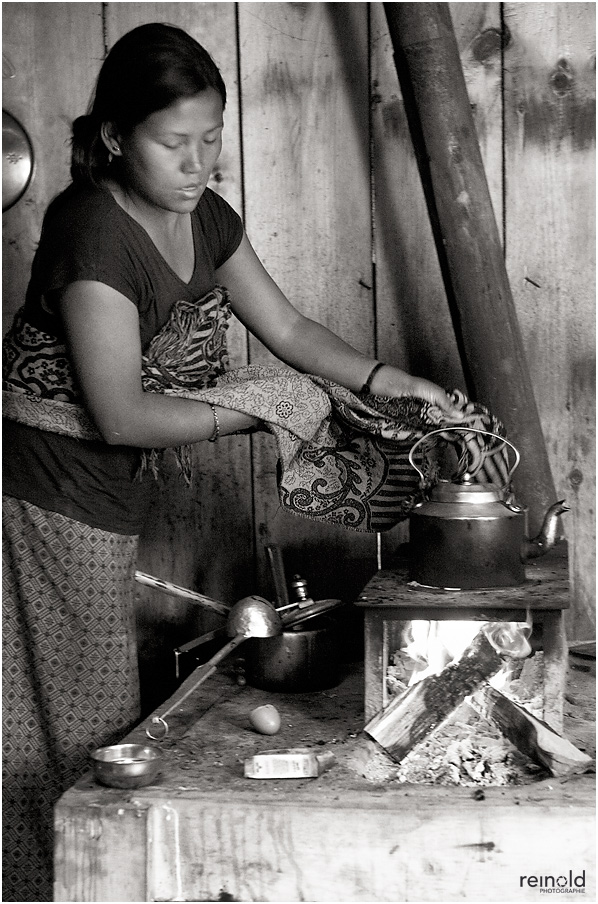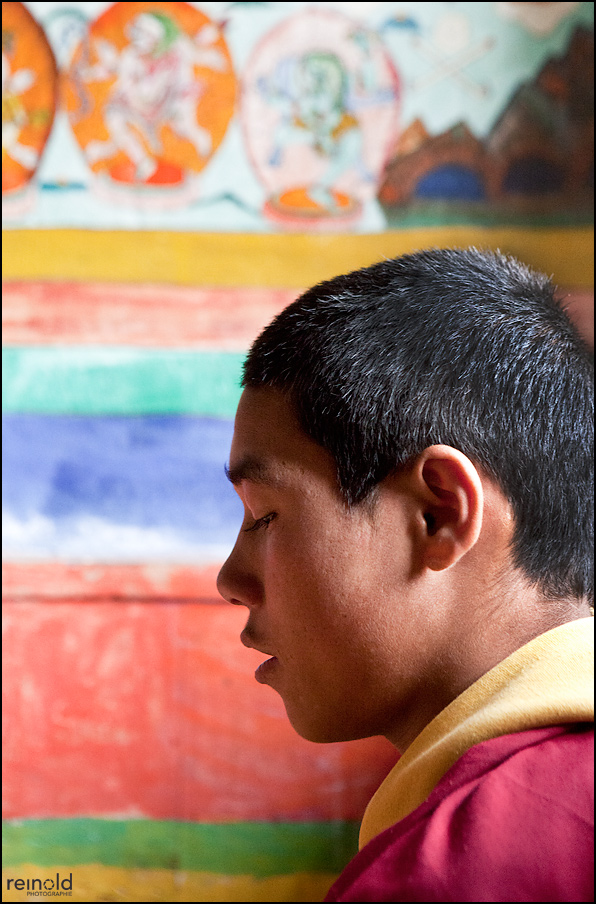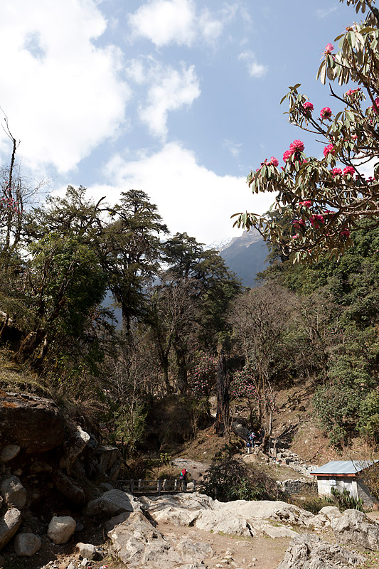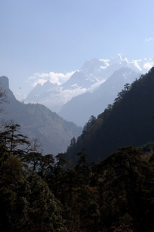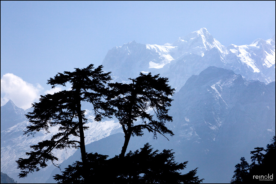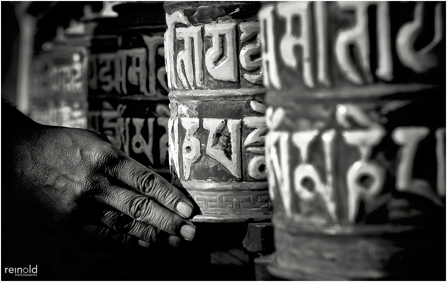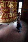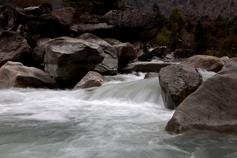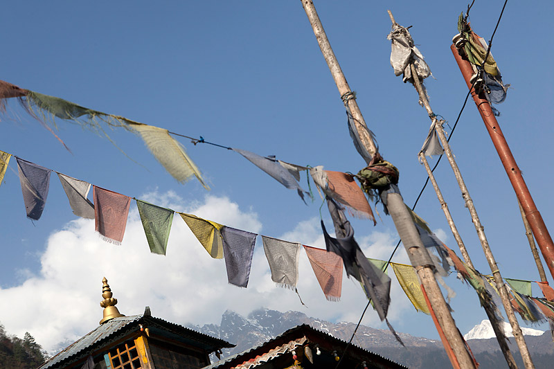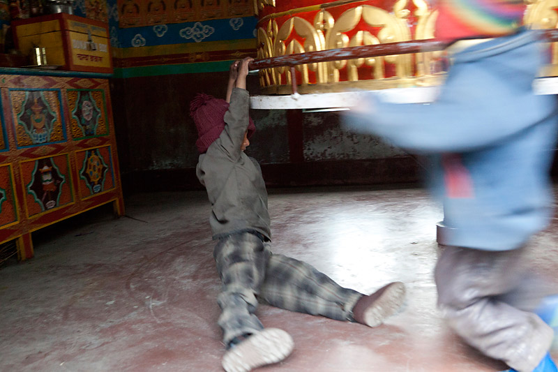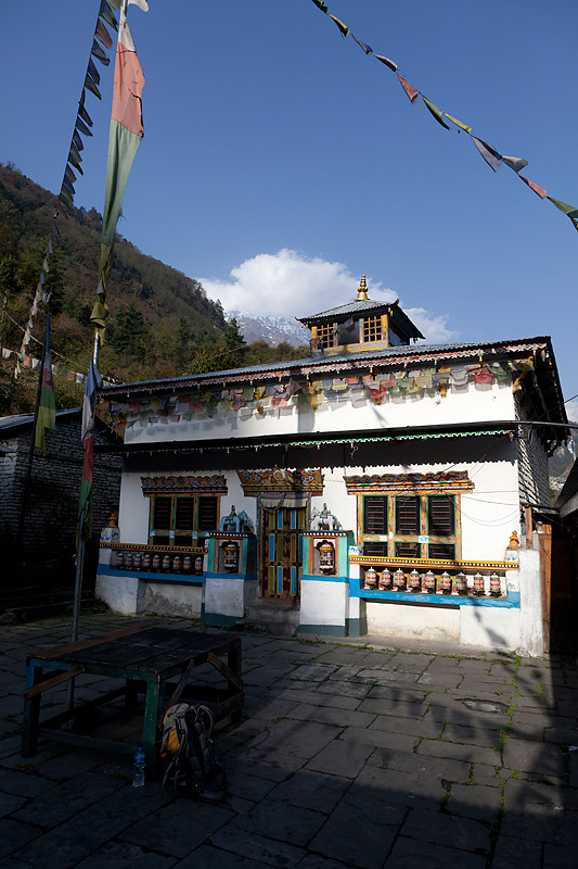 Gegen halb Acht machen wir uns auf den Weg. Zunächst zweigen wir zur Gompa ab, die aber leider verschlossen ist. Wir können uns so die Gompa nur von Außen anschauen. Hinter Chyamche beginnt ein ca. 30 minütiger Aufstieg bis nach Danakyo. Während des Aufstiegs haben wir zum ersten Mal einen tollen Blick auf das Manaslu Massiv. Immer wieder drehen wir uns um, um den Ausblick zu genießen. Nach dem ersten steilen Anstieg wird es nun zunächst wieder etwas flacher, bevor uns ein weiterer Anstieg bis Timang erwartet. Auch hier haben wir wieder einen fantastischen Blick zurück ins Manaslu-Massiv. Hier oben werden gerade einige neue Lodges gebaut. Ein toller Ort für eine Lodge. Durch einen Tannenwald führt uns nun ein breiter Weg leicht abfallend bis an den Syarkyo Kola, den wir überqueren. Danach geht es weiter bergauf bis nach Thanchok, wo wir unsere Mittagspause machen. Nach der Pause geht es über einen breiten Waldweg gemütlich weiter bis Koto. Hier gibt es auch wieder einen Checkpost für unsere Permits. Links, ein wenig abseits des Weges liegt eine kleine Gompa. Während Hari mit den Permits am Checkpost steht, gehen wir die wenigen Meter hoch zur Gompa. Wir haben Glück; es ist gerade Gebetsstunde. Wir dürfen die Gompa trotzdem betreten, setzen uns ruhig an die Seite und verfolgen die Zeremonie. Für diesen kleinen Ort und die kleine Gompa gibt es viele Mönche. Auch die Einrichtung der Gompa ist sehr schön. Ich freue mich, dass ich auch hier drinnen fotografieren darf. Das war jetzt sicherlich ein kleines Highlight der bisherigen Tour. Nach weiteren 45 Minuten Fußweg erreichen wir schließlich Chame, den Hauptort des Marsyanditales. Im Hotel Marsyandi Mandala bekommen wir Zimmer. Zimmer ist eigentlich nicht die richtige Bezeichnung. Es sind immer kleine eigenständige Hütten – richtig gemütlich. Da wir noch genug Zeit haben, machen wir uns auf, um den Ort zu besichtigen. Zuerst gehen wir auf die andere Flussseite zu den heißen Quellen des Ortes, die aber offensichtlich nicht mehr sprudeln. Man sieht zwar noch die Becken, aber ohne Wasser. Dafür ist die Flusslandschaft direkt neben den Quellen aber auch toll. In Chame kommen wir dann an einer großen Gebetsmühle vorbei, die in einem kleinen Häuschen steht. Die Kinder des Ortes nutzen das Teil als eine Art Karussell. Wir werden mit herein gezogen und die Kinder machen uns mit Handzeichen klar was sie wollen – wir sollen die Gebetsmühle kräftig drehen, damit sie sich während der Drehungen das Gestänge hängen können.