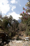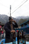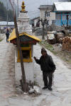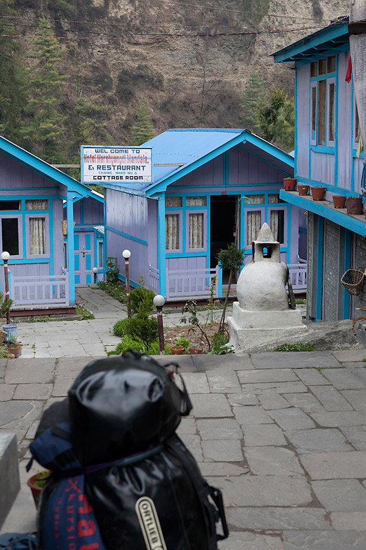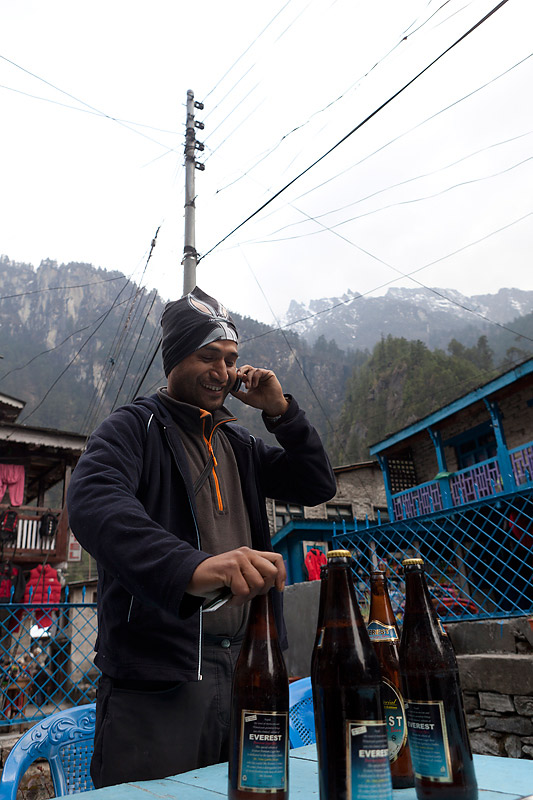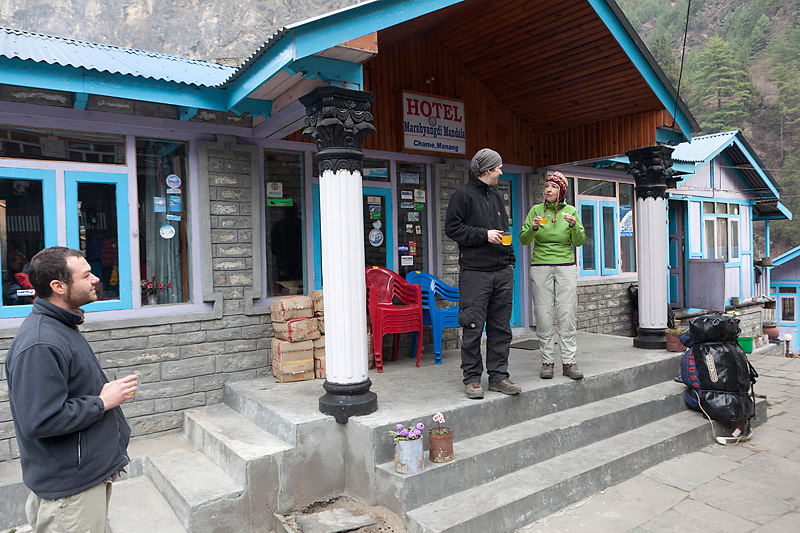 Man merkt, dass Chame der Hauptort des Tales ist. Es gibt viele Geschäfte, natürlich auch für uns Touristen. Wir fördern das Geschäft auch ein wenig und kaufen uns warme Mützen, die wir in den nächsten Tagen sicherlich noch gut brauchen können. Während wir auf der Terrasse unseres Hotels sitzen und es uns bei einem nepalischen Bier gut gehen lassen, sehen wir auch alle Touristen von gestern wieder, die ebenfalls den ort besichtigen. Die Meisten werden in den nächsten Tagen unsere ständigen Begleiter sein.