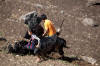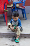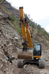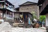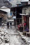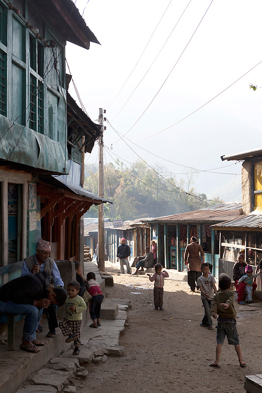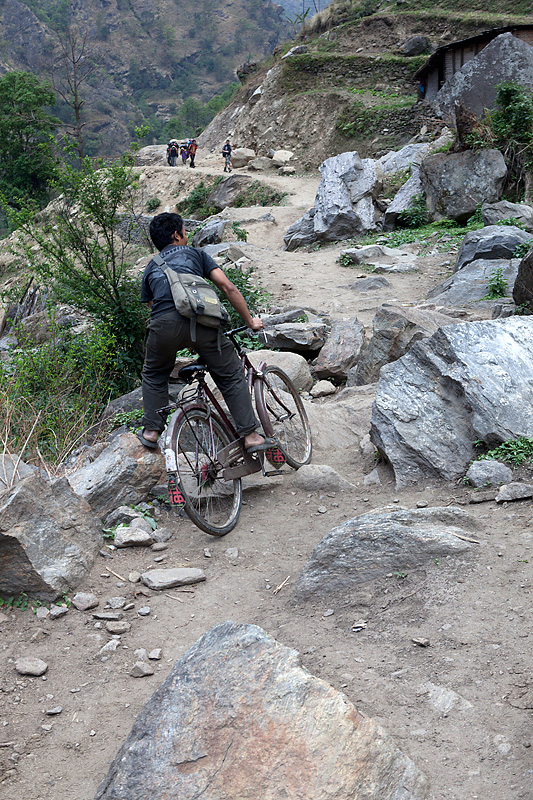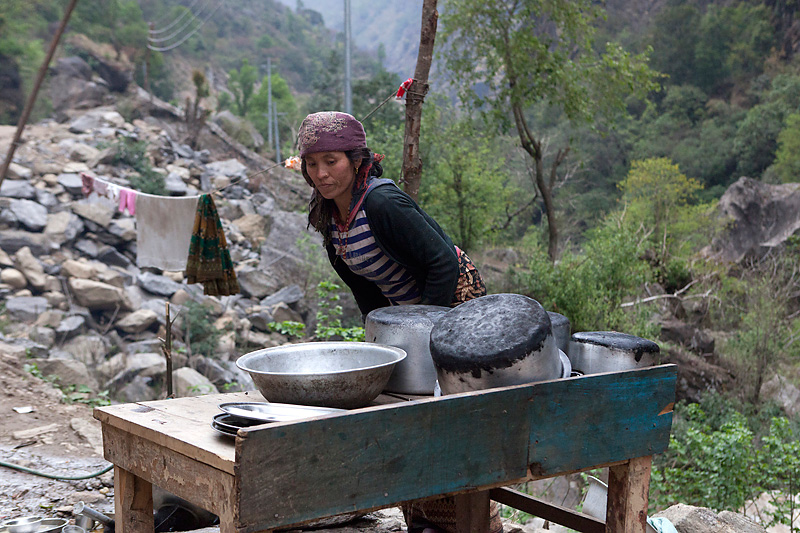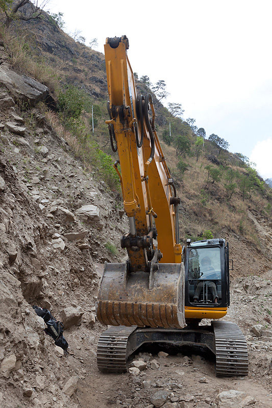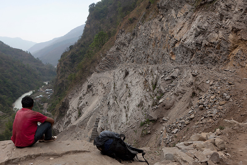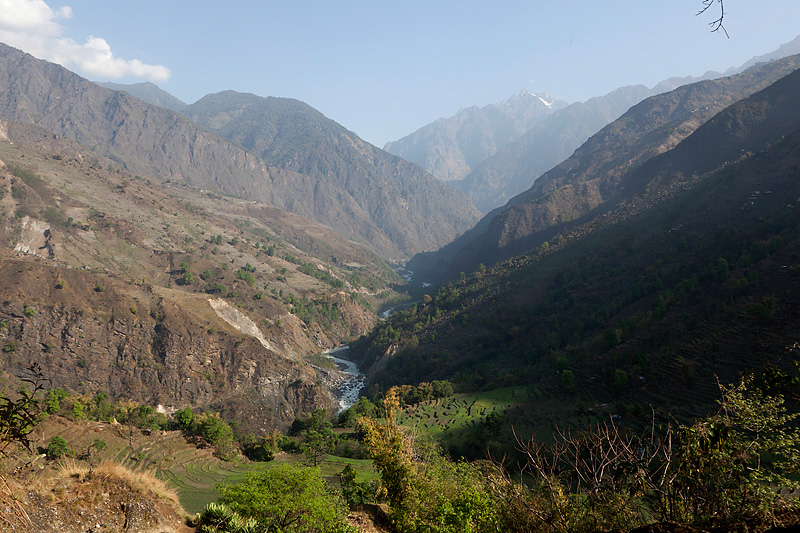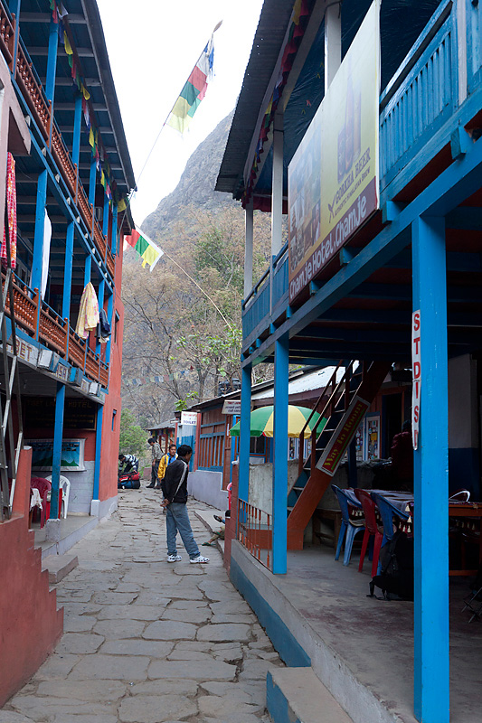 Immer weiter führt uns der Weg bergab, bis wir schließlich wieder den Marsyandi erreichen, den wir dann wieder über eine Hängebrücke überqueren. Hier erreichen wir wieder die Fahrstrasse, die wir jetzt bis Syange weiter gehen müssen. Inzwischen kann man bis hier her mit dem Jeep fahren. Gegen 11 Uhr machen wir in Syange Mittagspause. Wie wir hier erfahren ist der weitere Weg zur Zeit wegen Sprengungsarbeiten gesperrt. Erst um 13 Uhr soll die Sperrung aufgehoben werden. Wir können uns also mit unserer Pause Zeit lassen. Um kurz vor 13 Uhr machen wir uns dann wieder auf. Allerdings ist schon nach 10 Minuten unser Weg vorläufig zu Ende. Die Sperrung besteht weiter, weil die Sprengung wohl nicht erfolgreich war. Der Soldat, der die Sperrung des Weges bewachte, konnte uns nicht genau sagen, wie lange es noch dauern würde. Inzwischen hatte sich hier auch schon eine kleine Menschenmasse angesammelt, die alle nicht weiterkamen. Kurz vor 14 Uhr war es dann endlich soweit – die Sperrung wurde aufgehoben und wir konnten weiter. Der folgende Wegabschnitt war durch die Bauarbeiten nun alles andere als attraktiv. Um wenigstens einen Teil der Baustelle zu umgehen, zweigen wir rechts in den Hang über einen schmalen Trampelpfad ab und kürzen so zwei kehren der Strasse ab. Oben kommen wir dann jedoch wieder in den Straßenbau rein und können einen Baggerfahrer bewundern, der an dem doch recht steilen Berghang halsbrecherische Manöver vollführt. Zum Glück ist die Baustelle bald vorbei und wir können wieder auf einen angenehmeren Weg abzweigen. Allerdings sollte uns in den nächsten Tagen immer wieder der Baulärm von der anderen Flussseite begleiten. Oberhalb des Marsyandis geht es nun meistens recht flach aber zwischendurch auch mal etwas steigend bis nach Jagat.