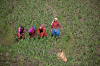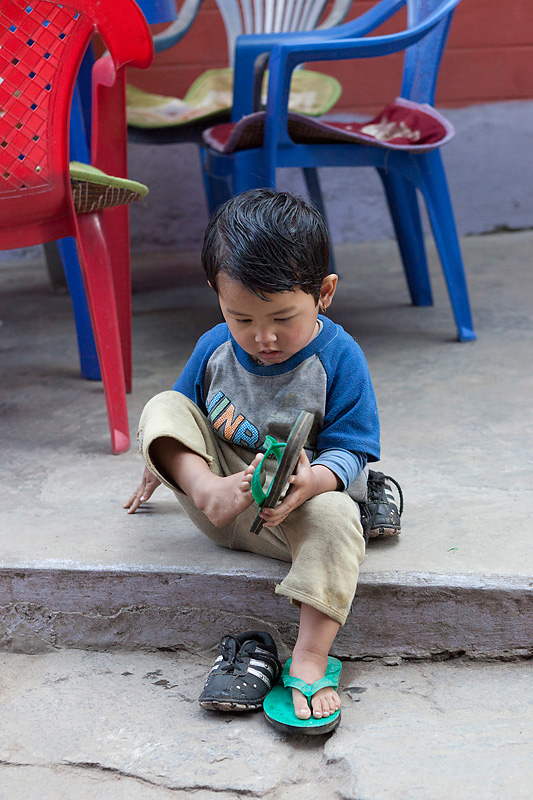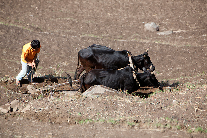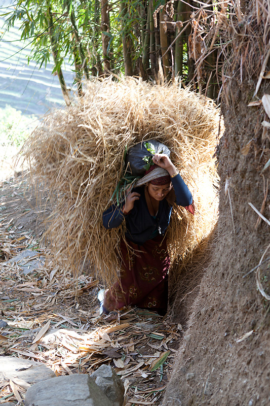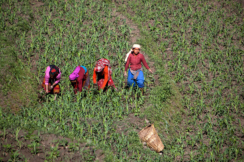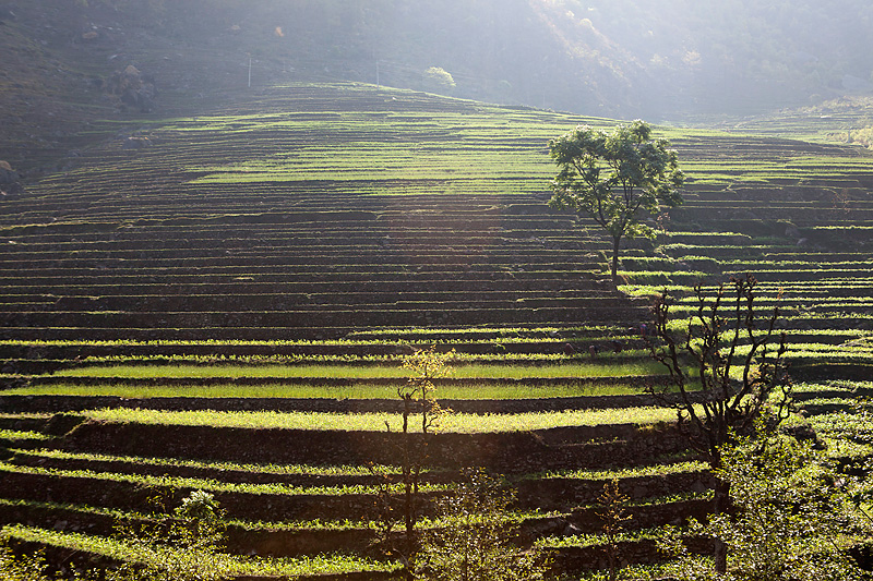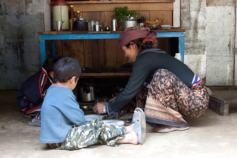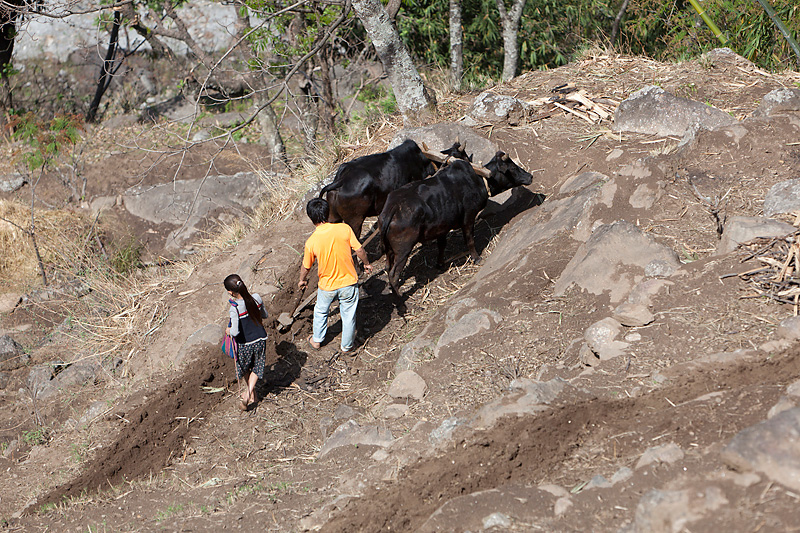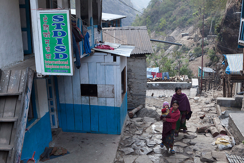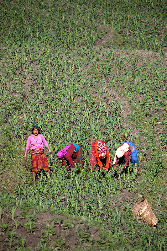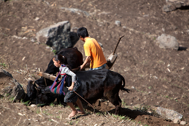 Am nächsten Morgen geht es gegen 8 Uhr wieder los in Richtung Chyamche. Es hat aufgehört zu regnen. Von unserer Lodge geht es zuerst über Treppen abwärts in den Ortskern von Bahundanda. Wir halten uns nun links. Der Weg fällt ständig leicht ab in Richtung Marsyandi. Wir kommen an Feldern vorbei, wo die Frauen fleißig arbeiten. Auf einem anderen Feld ist die ganze Familie mit den Kindern und den Büffeln dabei, zu sähen.