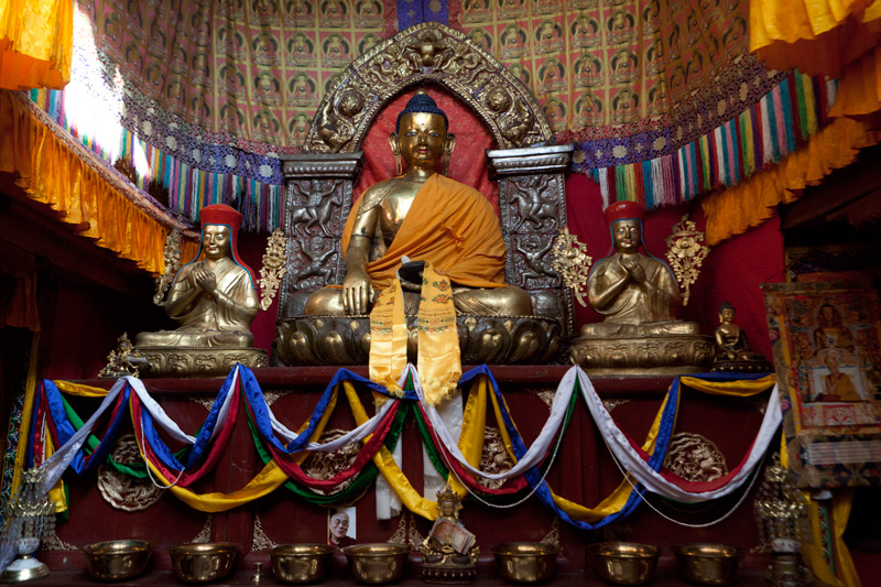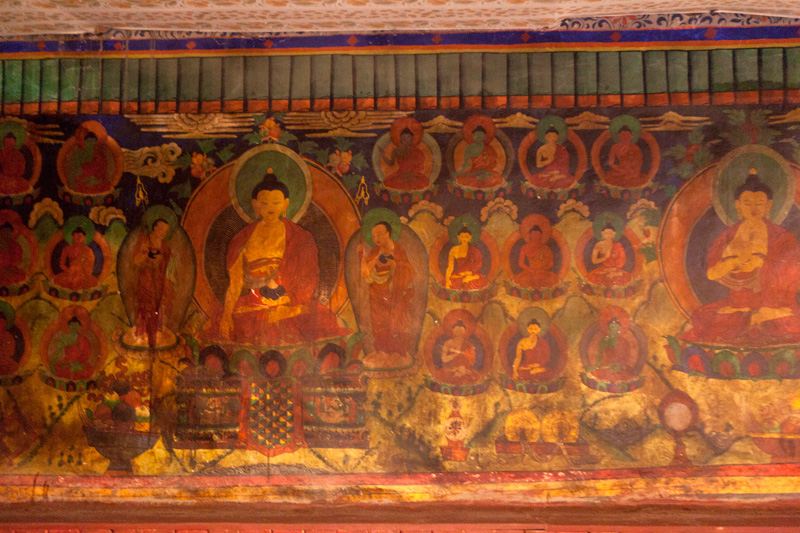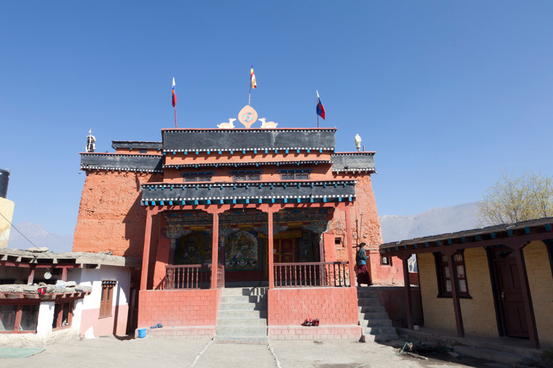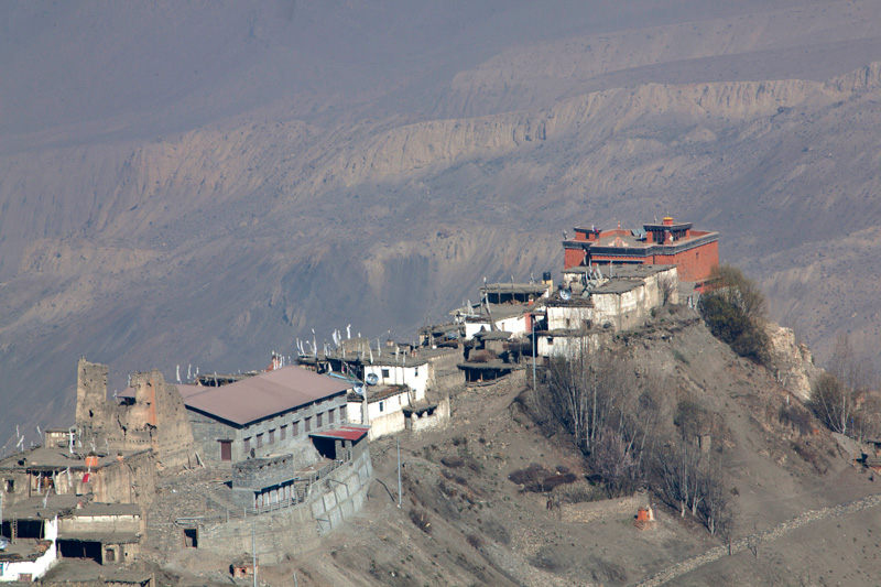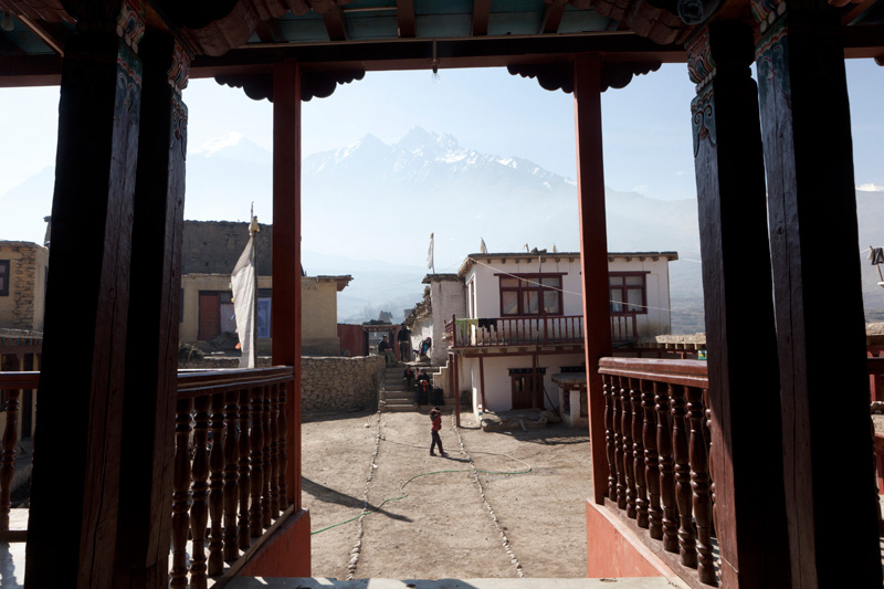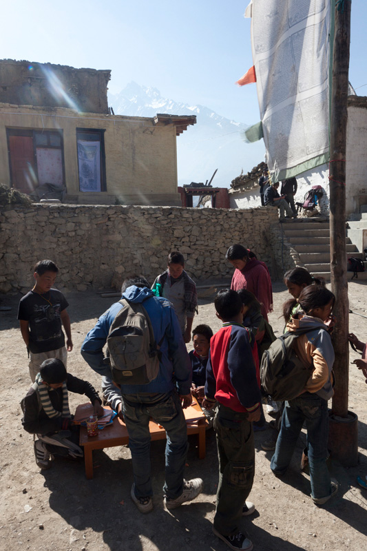 In Jharkot nutzen wir die Zeit und besuchen die Dorfgompa. Eine schöne Gompa, die einen Besuch lohnt. Im Klosterhof spielen die Kinder und eine kleine Schar von Kindern ist dabei ihre Schulbücher in Papier einzuschlagen.