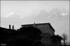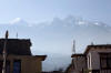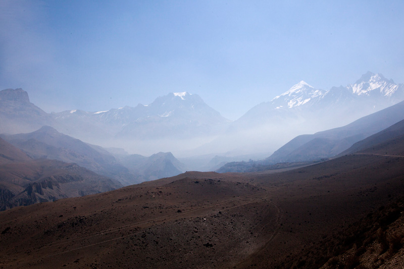 Auf dem weiteren Abstieg schauen wir dann nicht schlecht, als uns immer wieder Mountainbiker entgegenkommen und sich den Berg hoch quälen. Unsere letzten besuche hier waren immer in der Monsunzeit im Sommer. da haben wir so was nie gesehen. Der Blick runter ins Tal des Kali Gandaki ist sehr diesig. Vieles lässt sich nur erahnen. je tiefer wir kommen je stärker nimmt der Wind zu. das ist hier nichts ungewöhnliches. Gegen 10 -11 Uhr ist das im Tal die Regel. Aber heute ist der Wind schon außergewöhnlich stark. Langsam bekommen wir mit, dass der Dunst aufgewirbelter Staub aus dem trockenen Flussbett ist.