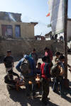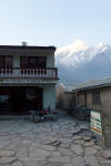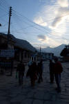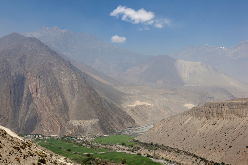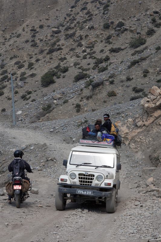 Wir steigen ab bis Kagbeni, machen noch einmal eine kleine Wanderung durch den Ort, den wir schon aus älteren Touren so gut kennen. Viele neue Häuser wurden hier in den vergangenen 2 Jahren gebaut. Von Kagbeni geht es nun talauswärts über Eklobati nach Jomosom. Eklobati ist schnell erreicht. In einer Lodge machen wir Mittag und lassen es uns gut gehen. Draußen sitzen ist wegen des starken Windes leider nicht möglich. Da von Eklobati nach Jomosom Jeeps fahren teilt, überlegen wir, ob wir das letzte Teilstück damit zurücklegen. Hari entscheidet sich mit dem Rest unserer Gruppe für den Jeep. Meine Frau und ich aber wollen auch das letzte Stück zu Fuß zurücklegen. Ein Fehler wie sich schnell herausstellt. Mit jedem Meter talauswärts nimmt die Windstärke zu. Wir müssen uns völlig vermummen, da starke Sandstürme uns entgegen wehen. Wir kämpfen uns Meter für Meter weiter in Richtung Jomosom, dass wir dann nach 2 Stunden völlig verdreckt erreichen. Unser Trost ist aber, dass auch die Jeepfahrt nicht wirklich angenehm war. Da die Jeeps von Muktinathpilgern besetzt waren, mussten unsere Jungs aufs Autodach ausweichen.