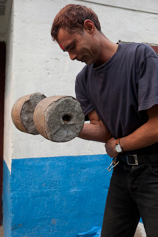 Die Wirtsleute des Maya-Hotels sind zwei junge Leute mit zwei Kindern im Alter von 6 und 10 Jahren. Der Mann ist ein Unikum. Mit seinen rötlich gefärbten Haaren sieht er nicht gerade nepalisch aus. Als er uns hinter dem haus sein "Fitnessstudio" zeigt kommen wir aus dem Staunen nicht mehr raus. Aus Stein hat er sich eine Langhantel und Kurzhantel gebastelt und zeigt uns was er damit so alles anstellen kann. Man sieht seinem Körper das Training an.