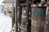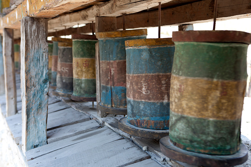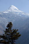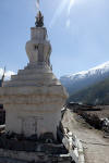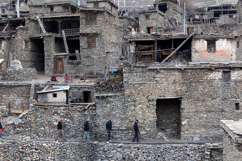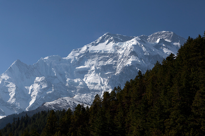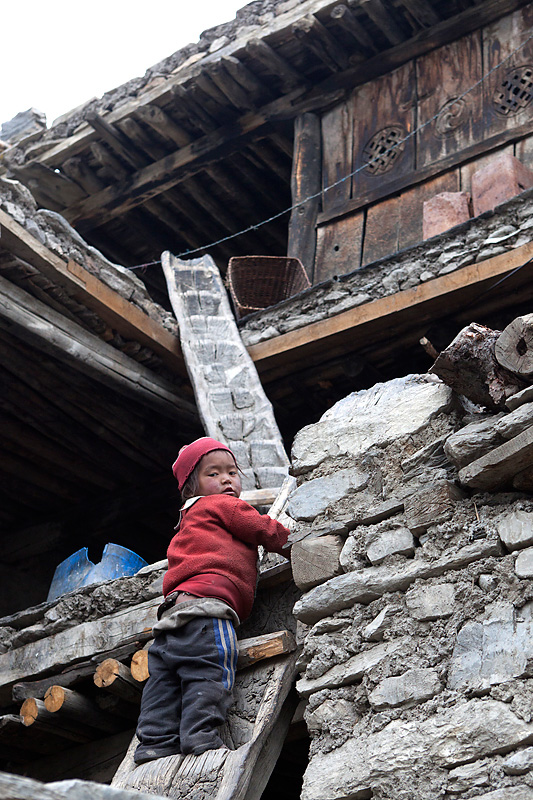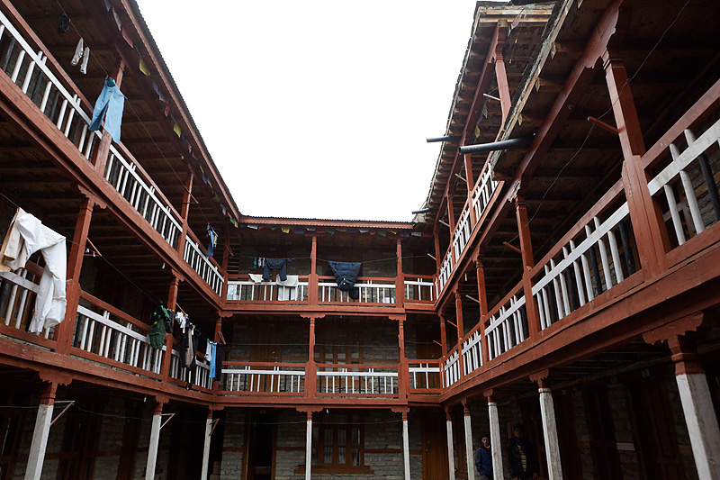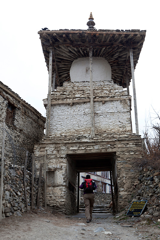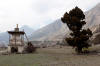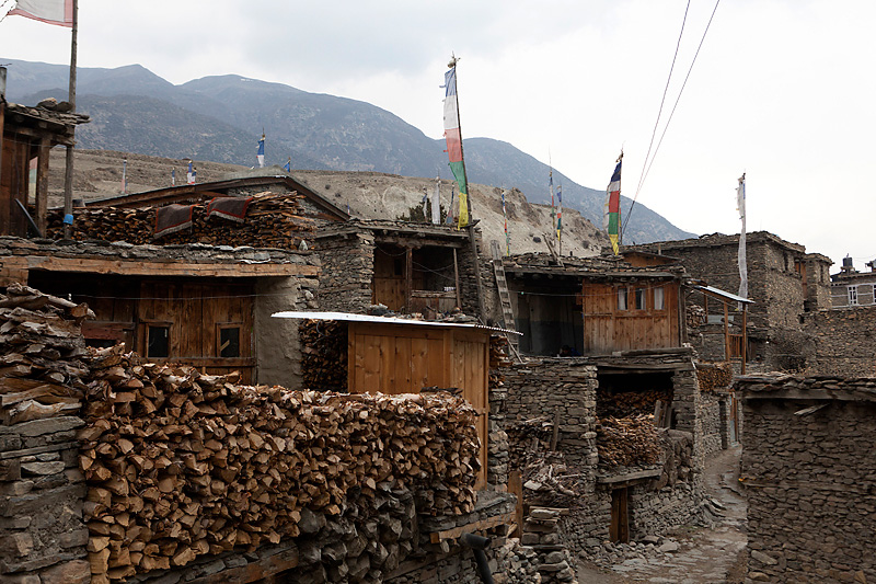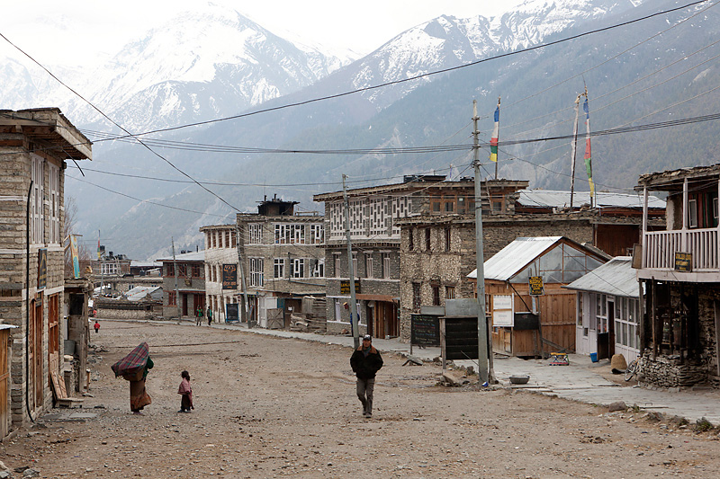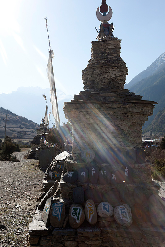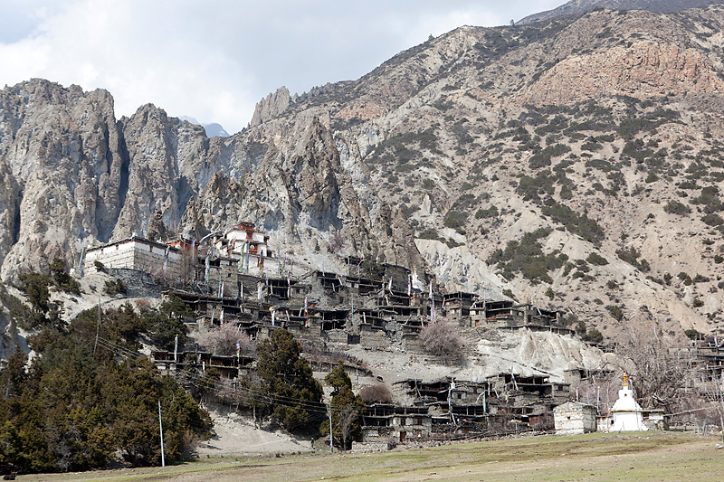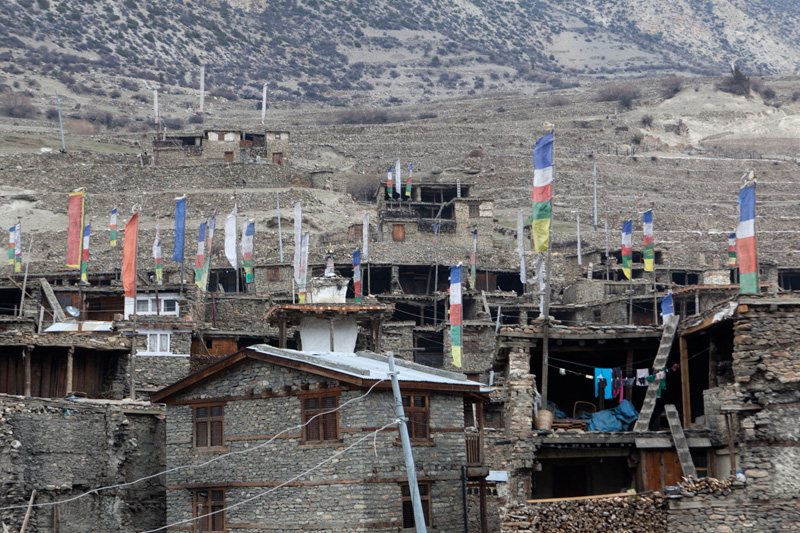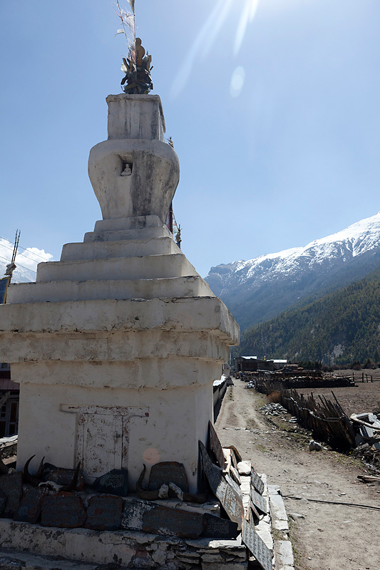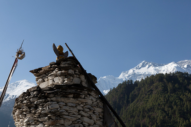 Mit Blick auf Annapurna II, Pisang Peak und Tilicho Peak geht der Weg weiter in Richtung Mugje, wo wir in einer netten Lodge am Wegesrand Pause machen. Von hier aus haben wir wieder so einen spektakulären Ausblick – diesmal auf Annapurna IV. Und das Wetter spielt weiter mit; wir haben strahlend blauen Himmel. Was wollen wir mehr. Nach der Pause geht es weiter nur flach ansteigend über Braga nach Manang. Hinter Braga heftet sich ein kleines Zicklein an die Fersen meiner Frau und entfernt sich immer weiter von seiner Herde. Schließlich nimmt einer unserer Begleiter Nabin das Kleine auf den Arm und bringt es zurück zur Herde. Wenig später tauchen die ersten Yaks auf. Fast wären wir daran vorbei gelaufen. Die Tiere hatten sich unten am Flussufer versammelt. Es sollten auf der ganzen Tour die einzigen Yaks sein, die wir zu sehen bekamen. Die Landschaft erinnert mich inzwischen ein wenig an Mustang. Die Bauart der Tschörten ist sehr ähnlich und auch die typischen Felszähne aus Mustang gibt es hier oben immer öfter. In Manang kommen wir im Hotel Tilicho unter. Ein sehr großes Haus mit Innenhof und zahlreichen Zimmern. Natürlich machen wir auch hier eine Ortsbesichtigung. In der Ortsmitte steht ein „Stupa“ umgeben mit vielen Gebetsmühlen. Die alten Häuser mit ihren flachen Dächern sind alle mit Gebetsfahnen geschmückt. Auf den Dächern ist das Holz für die kalten Wintertage zum trocknen gestapelt.