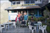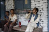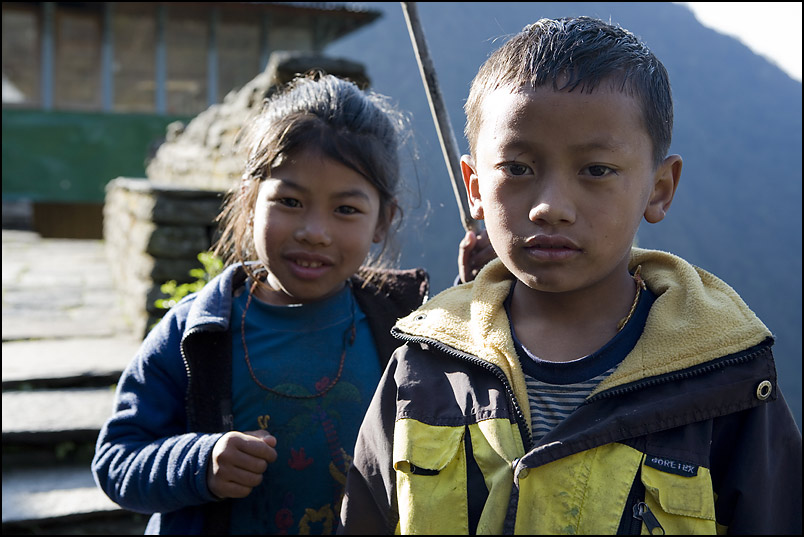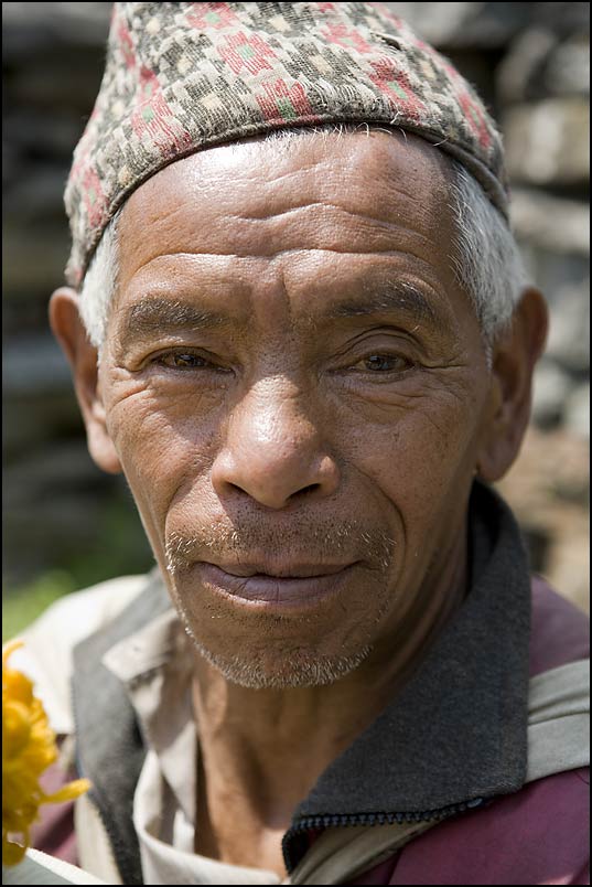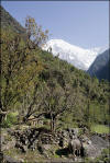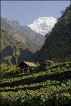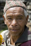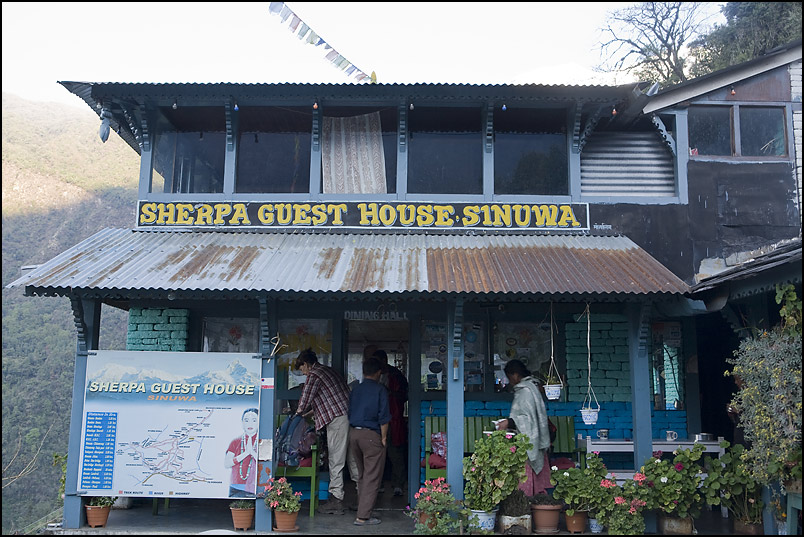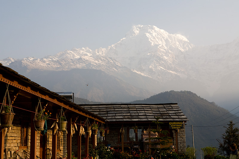 Nachdem wir den Kyumnu Khola überquert haben, steht uns nun wieder ein Aufstieg von 500 Metern hinauf nach Kimrong Danda bevor. Zum Glück liegt der größte Teil des Weges im Schatten und ungefähr nach der Hälfte des Aufstieges gibt es dann plötzlich auch wieder Mineralwasser zu kaufen. Das letzte Stück des Weges begleiten mich zwei Mädchen. Sie sind schwer beladen mit Brennholz. Ganz leicht scheinen sie den Weg nach oben zu bewältigen, wohingegen ich jetzt doch mächtig keuchen muss. Oben auf dem Pass ist schwer was los. Eine französische Gruppe hat fast alle Tische der Lodge belegt. Wir versuchen unser Glück in einer kleinen Hütte etwas abseits, erkennen aber schnell, dass wir dort wohl nicht zu essen bekommen. Als die Franzosen wenig später aufbrechen, wechseln wir die Lodge. Von Kimrong Danda geht es nun nur noch bergab. Als wir uns Ghandrung nähern, hat sich leider auch das Wetter wieder etwas verschlechtert und es beginnt sogar einmal leicht zu regnen. Aber den Wetterwechsel im Laufe des Tages kennen wir ja nun schon. Ghandrung ist der größte Ort der Region. Lodges scheint es zunächst überhaupt keine zu geben. Erst als wir uns der anderen Seite des Ortes nähern, tauchen sie auf. Schon früh hören wir Trommeln und Gesang in den Gassen des Ortes. Wir vermuten eine Hochzeit oder ähnliches, erfahren dann aber, das es Feierlichkeiten zum bevorstehen neuen Jahr in Nepal sind. Der nepalische Kalender weicht von unserem ab. Er orientiert sich an den Mondphasen. Das nepalische neue Jahr 2064 beginnt nach unserer Zeitrechnung am 14. April 2007. Die erste Lodge die wir ansteuern ist leider belegt. Schade, denn sie machte von Außen einen schönen gemütlichen Eindruck. Im „Trekkers Inn Hotel“ bekommen wir dann Zimmer sogar mit Dusche und WC. Ein ungewöhnlicher Luxus hier oben. Der Speiseraum erinnert auch mehr an ein Hotel als an eine Lodge. Die Gemütlichkeit fehlt hier irgendwie. Während des Essens geht plötzlich geht die Tür des Speiseraums auf und die Trommler und Sänger, die wir bereits am Nachmittag gehört haben, ziehen durch den Raum. Sie besuchen im Laufe der nächsten Tage auf diese Art und Weise jedes Haus des Ortes. Da heute der letzte gemeinsame Abend mit unseren Trägern ist, bereiten wir unsere Abschiedsfeier vor. Wie üblich haben wir für Prem, Birjar und Sandra Pakete mit Kleidungsstücken und Ausrüstungsgegenständen zusammengestellt. Außerdem erhält jeder noch einen Umschlag mit einem dicken Trinkgeld. Wir hoffen, dass es nicht unsere letzte gemeinsame Tour war, wenn wir bei Prem wohl leider davon ausgehen müssen. Seine Familie hat ihn schon diesmal nur noch gehen lassen , weil er mit uns unterwegs war und die Tour nicht so anstrengend war. Sie sind der Meinung, er ist nun zu alt, um noch als Träger zu arbeiten. Und wenn man ehrlich ist, dann haben sie auch Recht. Meine Frau bekommt im Laufe des Abends starke Kopf- und Hals- und Gliederschmerzen. Irgendwie scheint die Grippe in unserer kleinen Gruppe umzugehen. Zum Glück wirken auch bei ihr die Paracetamol. Am nächsten Morgen geht es ihr schon wieder deutlich besser.
