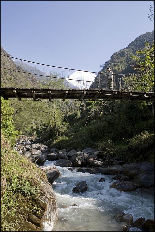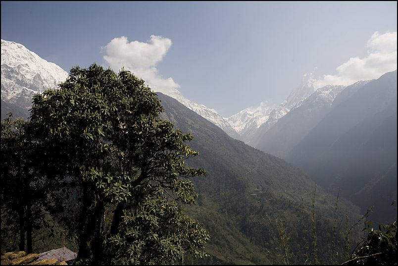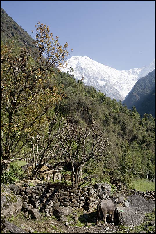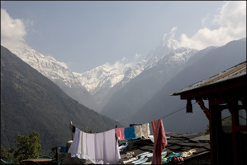 Von Sinuwa geht es zunächst einmal 300 Höhenmeter bergab zum Chomrong Khola. Dabei sehen wir, wie vor einigen Tagen genau in die andere Richtung, unser nächstes Ziel Chomrong auf fast gleicher Höhe liegen. Das Wetter ist wieder wunderbar. Am Chomrong Khola und beim anschließenden Aufstieg hat man ständig die Annapurna South im Blick. Der Aufstieg dauert lange, da wir immer wieder voller Faszination eine große Population von Geiern beobachten, die über dem Tal ihre Kreise ziehen.