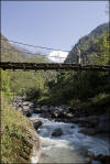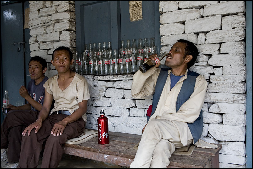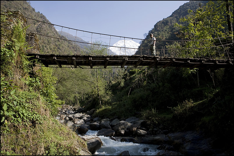 In Chomrong werden unsere Nasen dann plötzlich mit ganz ungewöhnlichen Düften überrascht. Eine „German Bakery“ am Wegesrand bietet ganz frische Schokobrötchen an. Während wir auf die frischen Brötchen warten, kann auch der tibetische Händler nebenan noch ein Geschäft machen. Die Preisverhandlung verläuft typisch für nepalische und vor allem für tibetische Händler. Zunächst einmal wird ein utopisch hoher Preis genannt, bei unserer Preisvorstellung dann gespieltes Entsetzen, um dann zum Schluss doch deutlich unter dem Eingangsangebot zu bleiben; vorausgesetzt man bleibt als Kunde hartnäckig. Hier in Chomrong weichen wir nun von dem bisher bekannten Rückweg ab und folgen dem Hinweisschild in Richtung Ghandrung, unserem heutigen Etappenziel. Von Chomrong zieht sich der Weg erst einmal am Hang entlang. Eigentlich hatten wir erwartet, dass es von hier bergab zum Kyumnu Khola gehen würde. Aber ein großer Erdrutsch hat den ursprünglichen Weg weggerissen und der neue Weg geht über einen Bergsattel, der uns noch einmal 200 Höhenmeter nach oben abverlangt. Bei den nun wieder heißen Temperaturen fließt der Schweiß in Strömen. Oben angelangt ist der Abstieg nun entsprechend länger. Während der 500 Meter abwärts werden wir immer wieder von Mulikarawanen aufgehalten, die voll bepackt mit Kerosinfässern den Berg hochkommen. Unten am Fluss können wir mehrere Lodges erkennen und wir hoffen hier endlich wieder Mineralwasser zu bekommen. Das gefilterte Wasser im oberen Bereich der Tour schmeckt nicht besonders. Leider werden wir enttäuscht; hier unten ist noch „mineralwasserfreie Zone“. Trotzdem machen wir eine kleine Pause allerdings mit Cola. Nicht nur wir, sondern auch viele andere Trekker scheinen genug von dem gefilterten Wasser zu haben, denn leere Colaflaschen gibt es ohne Ende. Die Getränkepolitik im Schutzgebiet muss man wohl nicht wirklich verstehen. Mineralwasserflaschen aus Plastik und Bierflaschen aus Glas sind verboten. Erlaubt sind aber Bierdosen und Flaschen für Cola und Limonade. Das verstehe wer will.