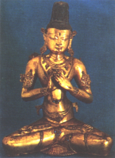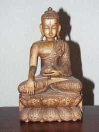 Shakyamuni Mit Buddha Shakyamuni ist der historische Buddha gemeint. Sein Vater war Herrscher des Königreiches Shakyas im heutigen Nepal. Die Bezeichnung Buddha Shakyamuni leitet sich von hier ab und bedeutet "Der Weise aus dem Geschlecht der Shakya". Darstellung: Die rechte Hand berührt den Boden. Dies soll ihn als Künder der Wahrheit ausweisen. In der linken Hand hält er einen Almosentopf als Zeichen des Ordensleiters. Im Lotussitz sitzt er auf einem Lotussockel. Dies versinnbildlicht die Reinheit.