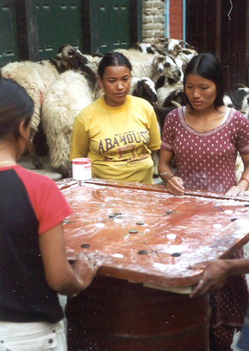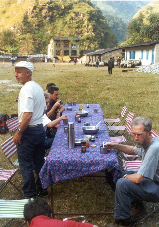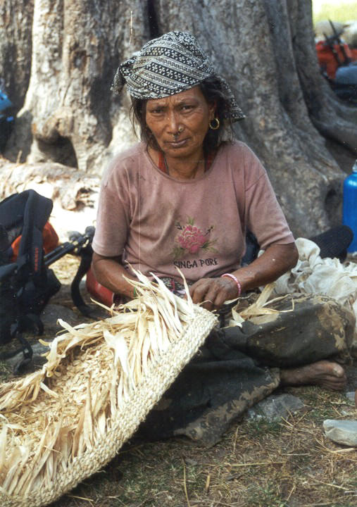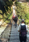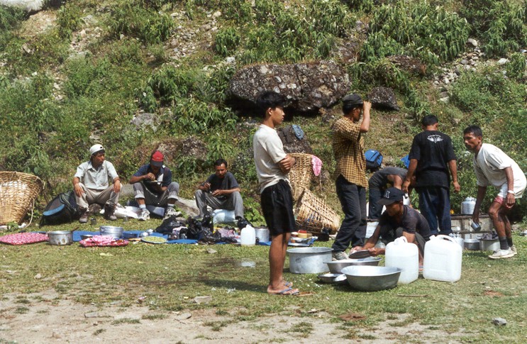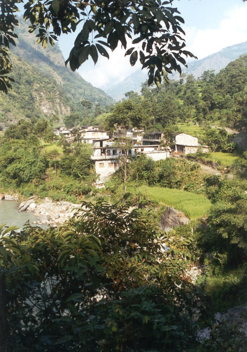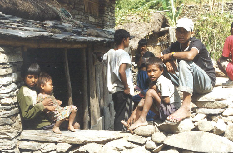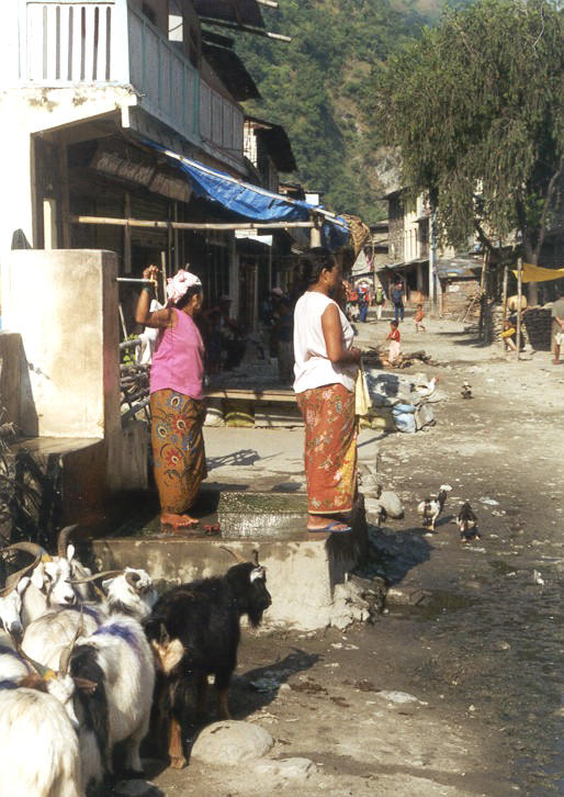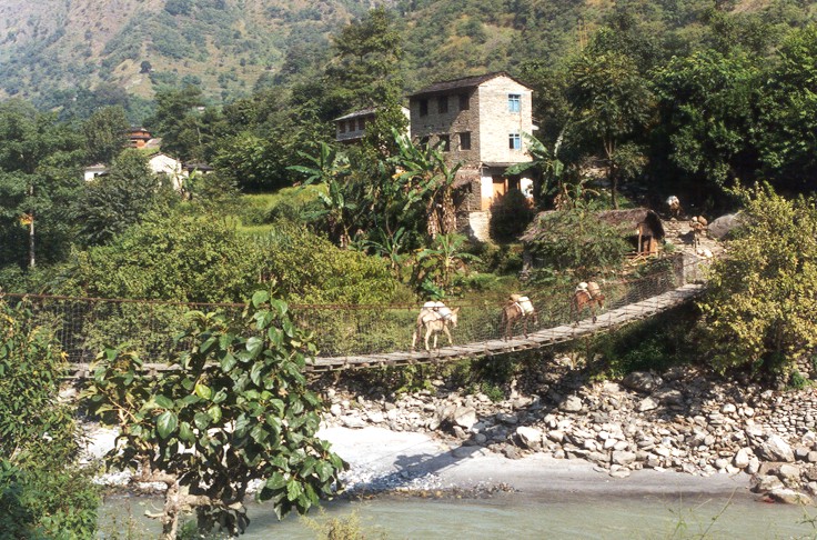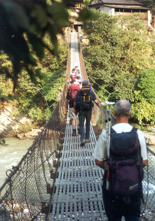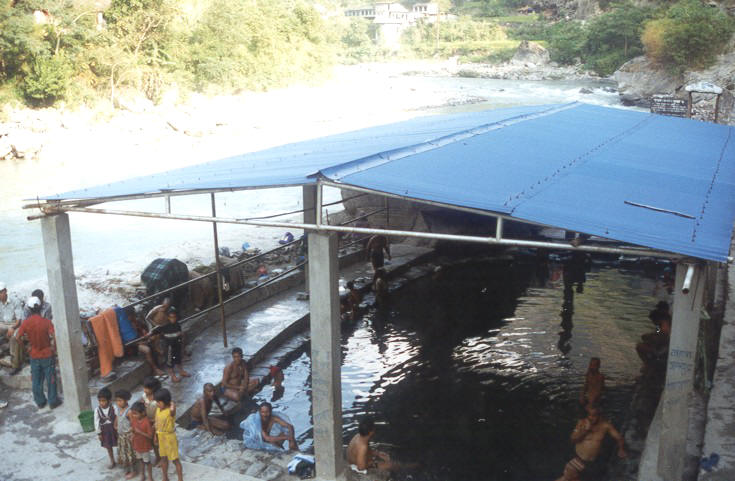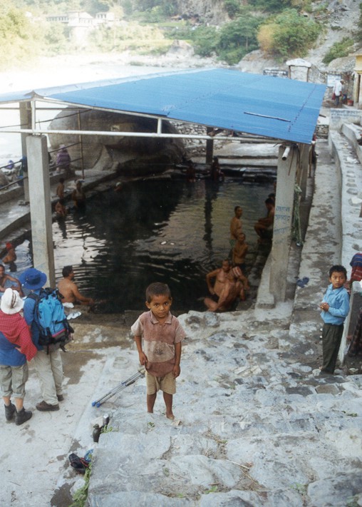 Ein Doppelklick auf ein Foto vergrößert das Bild! Von Singa aus geht unsere erste richtige Tagesetappe nach Darbang. Erste Etappe auf unserem Weg ist jedoch Tatopani, was übersetzt heißes Wasser bedeutet. In Tatopani gibt es eine heiße Quelle die direkt am Ufer des Myagdi Khola liegt. Der Myagdi Khola wird uns die nächsten Tage immer begleiten. Durch sein Tal und vorbei an seinen Hängen, folgt unser Weg. Das heiße Wasser von Tatopani wird in ein großes Badebecken geleitet. Viele Einheimische sitzen genüsslich in dem warmen Wasser und scheinen es offensichtlich zu genießen. Allerdings halten sich alle nur am Beckenrand auf. Als wir nach der Temperatur des Wassers fragen, wird uns ziemlich schnell klar warum das so ist. Das Wasser hat in der Mitte des Beckens eine Temperatur von 45 Grad und kühlt zum Rand hin ab. In der Mitte des Beckens trennt ein Seil das Becken in einen Bereich für Männer und einen Bereich für Frauen. Dieses Tatopani ist übrig3ens nicht mit dem Tatopani im Kali Gandaki Tal zu verwechseln, wo es ebenfalls heisse Quellen gibt. Die heißen Quellen von Tatapani Das Bad ist nach Geschlechtern unterteilt Tatopani Von Tatopani geht es weiter entlang des Myagdi Khola, den wir kurz darauf zwei mal überqueren. Die zweite Brücke ist dabei in einem recht maroden Zustand. Einer unserer Gruppe bricht mit einem Brett fast durch. Zum Glück gibt es keine Verletzung. In dem Tal ist es fürchterlich heiß, der Schweiß rinnt in Bächen aus dem Gesicht und das Hemd ist völlig durchnässt. Als wir eine kleinere Anhöhe erreichen wird es durch den aufkommenden Wind etwas angenehmer, aber die gewonnene Höhe verlieren wir sofort wieder beim Abstieg runter zum Fluss. In Shiman Der Warentransport erfolgt hier mit Mauleseln Kurz hinter Babiachaur machen wir unsere Mittagspause. Babiachaur ist ein für dortige Verhältnisse größerer Ort, in dem es ein großes Warenangebot gibt. Auf unserem Weg gehen sehr viel vorbei an Reisfeldern, die terrassenförmig so weit wie möglich angelegt sind. Aber auch sehr viele Obstbäume gibt es. Bananen, Zitronen und Papayas sind am Wegesrand zu finden. Der Weg geht in einem ständigen leichten auf und ab, ohne jedoch viel an Höhe zu gewinnen. Mutter mit ihrer Kinderschar in Ratodhunga Brücke über den Myagdi Khola Kinder in Ratodhunga Frau beim Flechten eines Korbes Unser Kochteam bei der Arbeit Nach 6 Stunden Gehzeit erreichen wir schließlich unser Tagesziel Darbang. Wir schlagen unsere Zelte wieder auf dem Schulhof auf. Da die Schule bereits beendet ist, werden wir nicht mehr von ganz so vielen Kindern begrüßt wie gestern. Einige Jungs des Ortes spielen mit einem Ball und schießen auf ein Tor. Als ich mit zu ihnen setze und zuschaue, scheint das ihre Motivation ernorm zu erhöhen. In Darbang bekommen wir in einem Laden Mineralwasser zu kaufen, was wir bisher nirgendwo gefunden haben. Nach der ganzen Schwitzerei des Tages tut es gut, eine Flasche Mineralwasser zu trinken und nicht den ganzen Flüssigkeitsverlust mit Schwarztee ausgleichen zu müssen. In den Strassen von Darbang wird gezockt Unser Campingplatz auf dem Schulhof von Darbang Kinder in Darbang Ortsausgang von Darbang in Richtung Sibang. Der Myagdi Khola wird überquert.