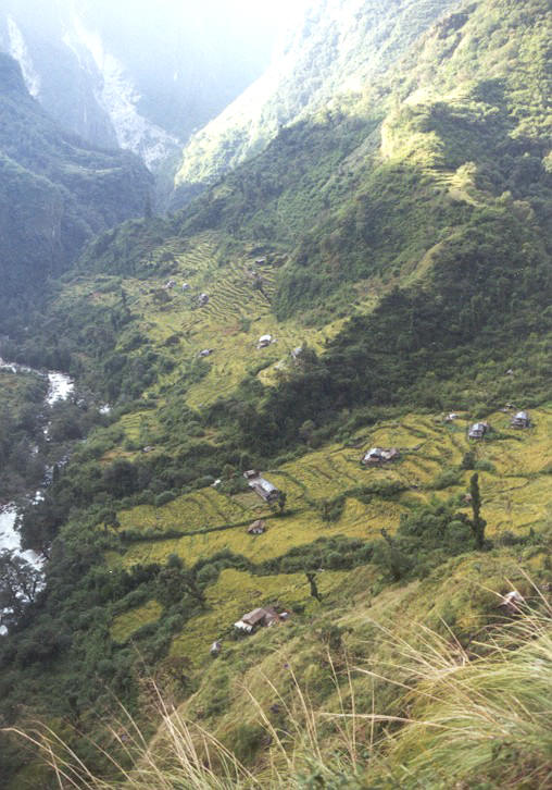 steigen wir ca. 200 Höhenmeter hinab ins Tal des Myagdi Khola. Kurz nachdem wir