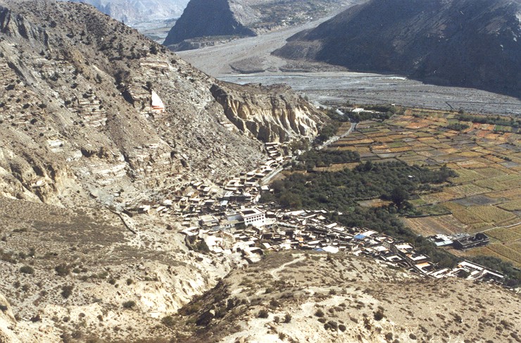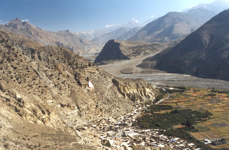 ersten Häuser auf. Marpha ist in den Hang gebaut auf dem wir absteigen.