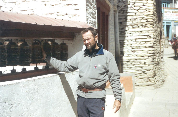 Aufstieg ist mit Gebetsmühlen gesäumt. Ein älterer Mönch ist so nett und zeigt