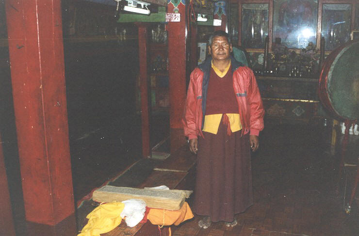 uns das Innere der Gompa. Auch die tibetischen Gebetsbücher zeigt er uns.