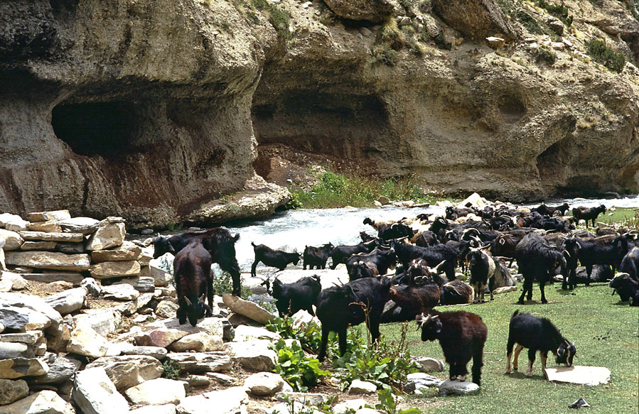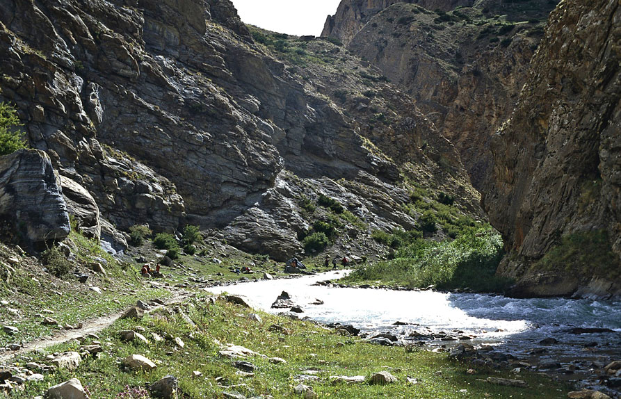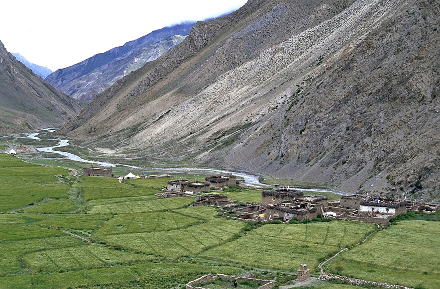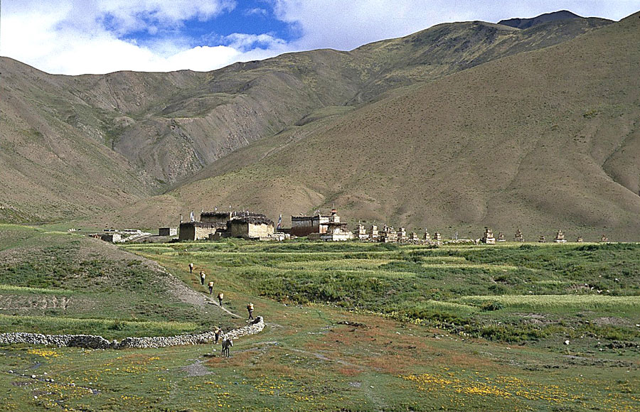 Landschaft talaufwärts. Nach 3 Stunden haben wir Dho erreicht. Schon von weitem