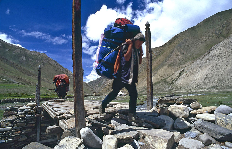 mit dicken Holzbalken beladen auf dem Weg nach Dho sind, interessieren sich