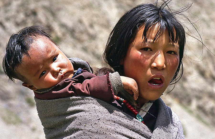 Kinder tragen ihre kleinen Geschwister auf dem Rücken, mit einem langen breiten