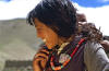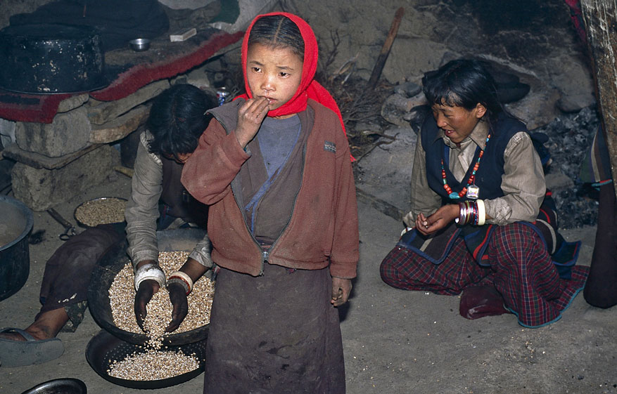 uns zur Wassermühle des Ortes, wo Tsampa, Gerstenmehl gemahlen wird, ein Mädchen