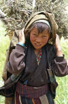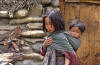 kleinen Mädchen, die mit riesigen Dokos Brennmaterial unterwegs sind.