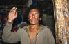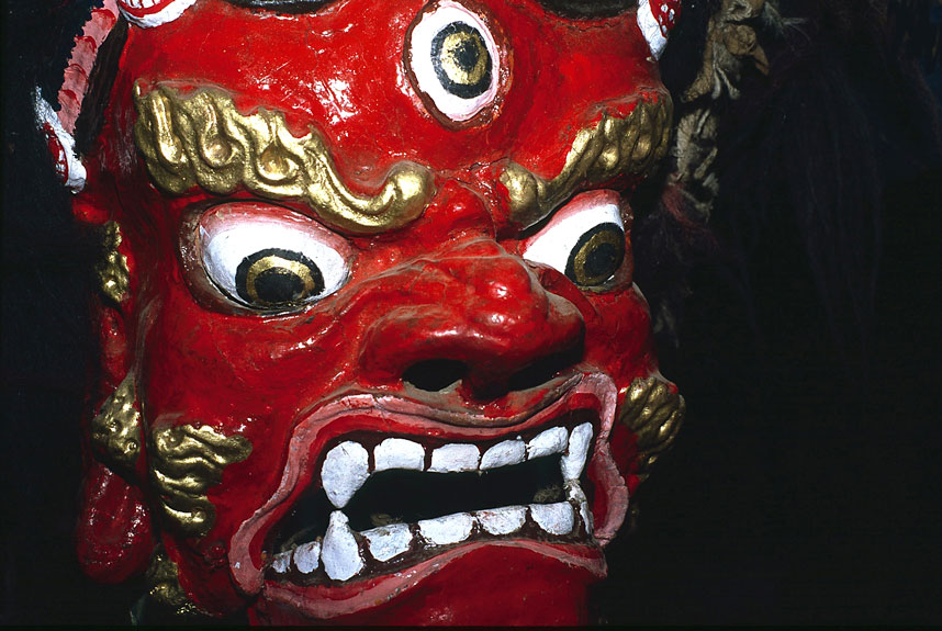 Die Gompa ist mit wilden Masken geschmückt und der alte