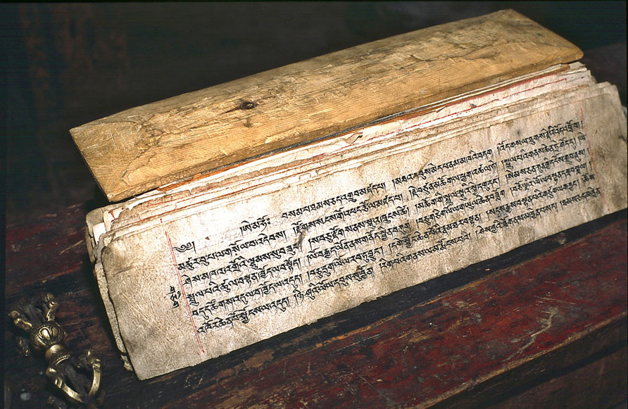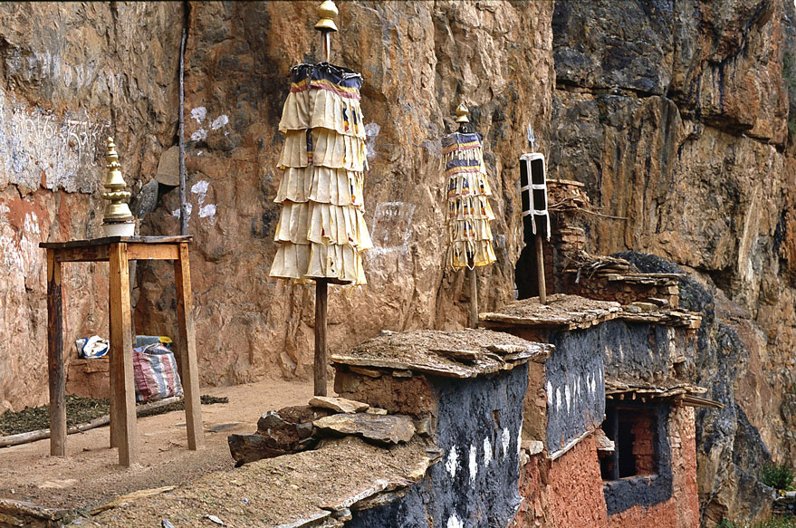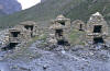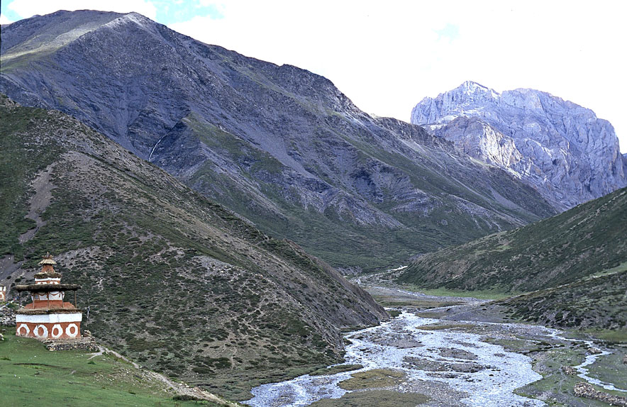 wasserbetriebenen Gebetsmühlen und die riesige Manimauer an. Aus zwei Hütten