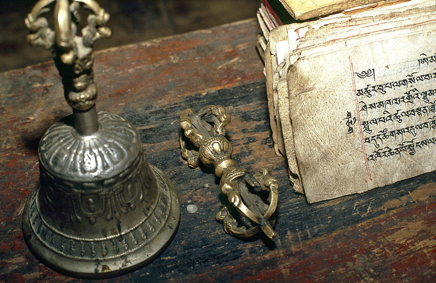 Über eine Holzstiege gelangen wir in die erste Etage der Gompa. Dort bereitet