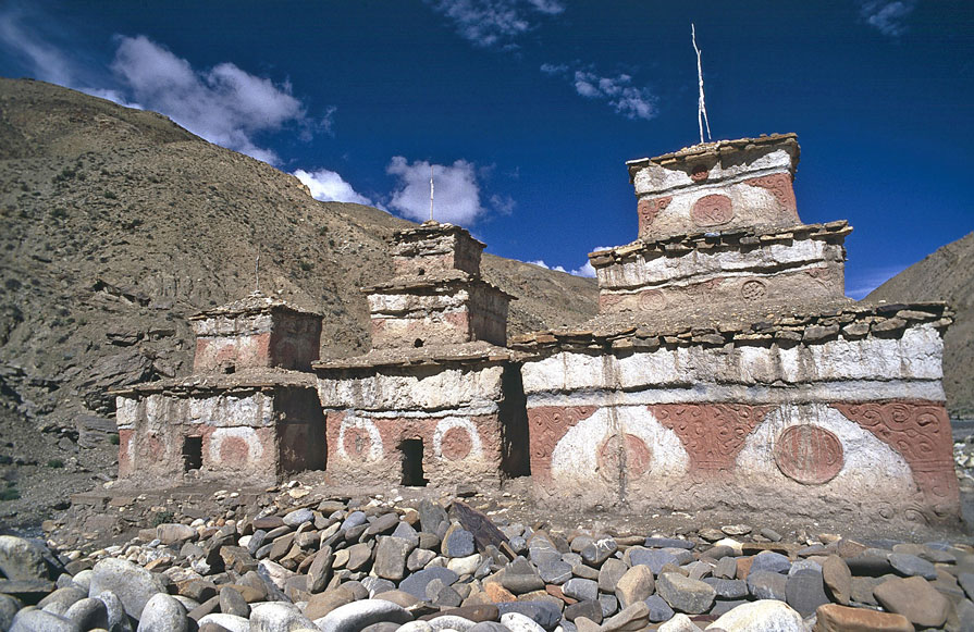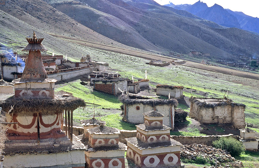 Hinter neun großen Tschörten befindet sich der Klosterkomplex der aus drei