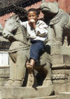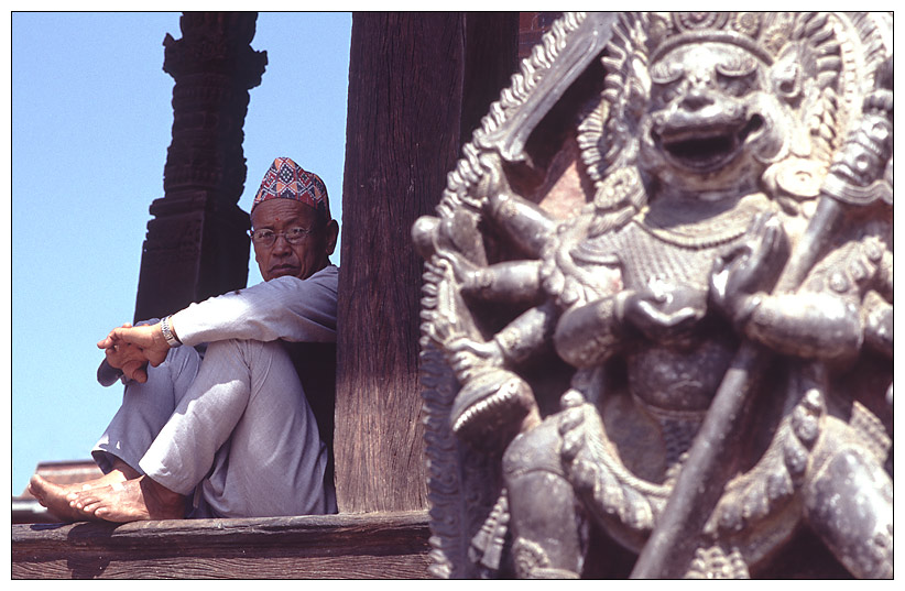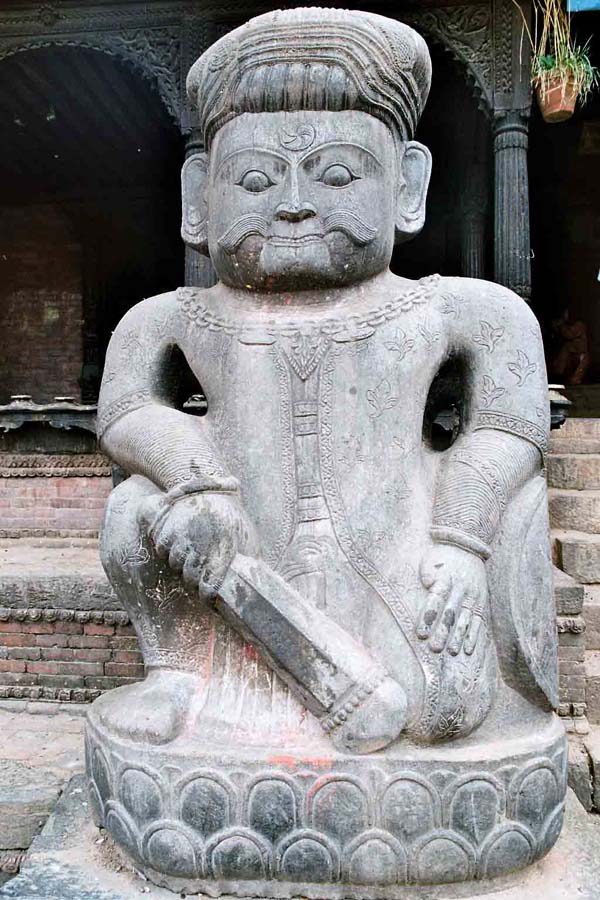 Figurenpaar vor dem Nyatapola-Tempel erinnern. Vor dem Tempel steht eine Säule