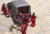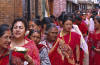 die Frauen in roten Saris durch die Strassen Schlange, um am Tempel ihre Gaben