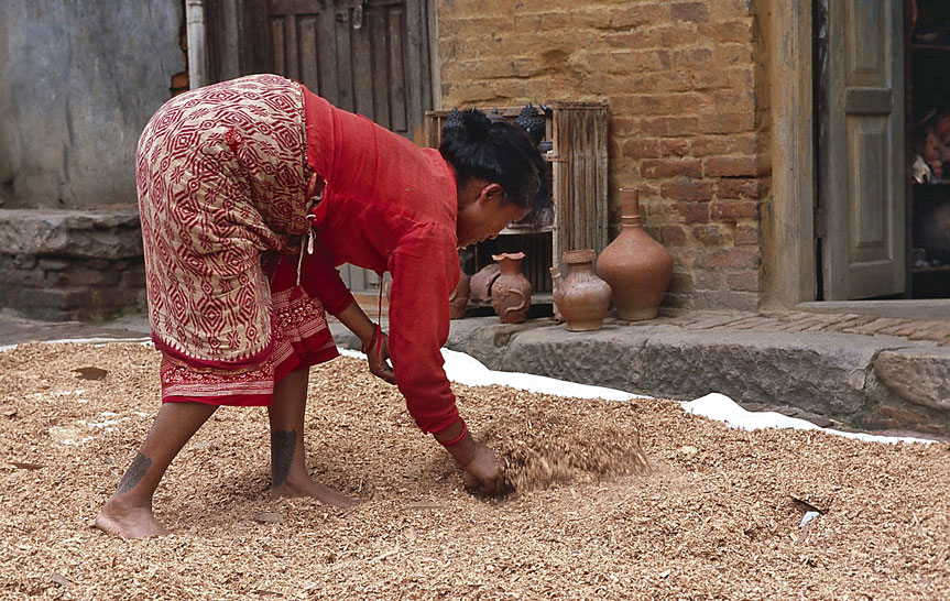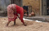 Trocknen ausgelegt. Auf dicken Bastmatten wird mit Holzschiebern der Reis in der