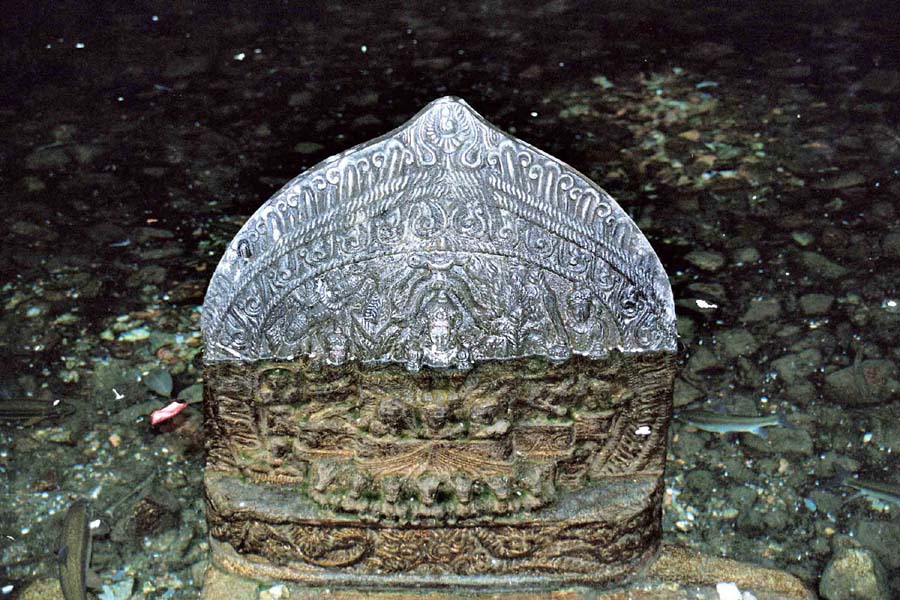Vishnus heraus, die von Forellen umkreist wird. Über eine Treppe mit 50 Stufen