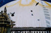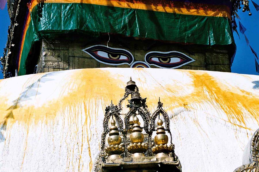einen terrassenförmigen Unterbau. Die groß aufgemalten Augen Buddhas blicken