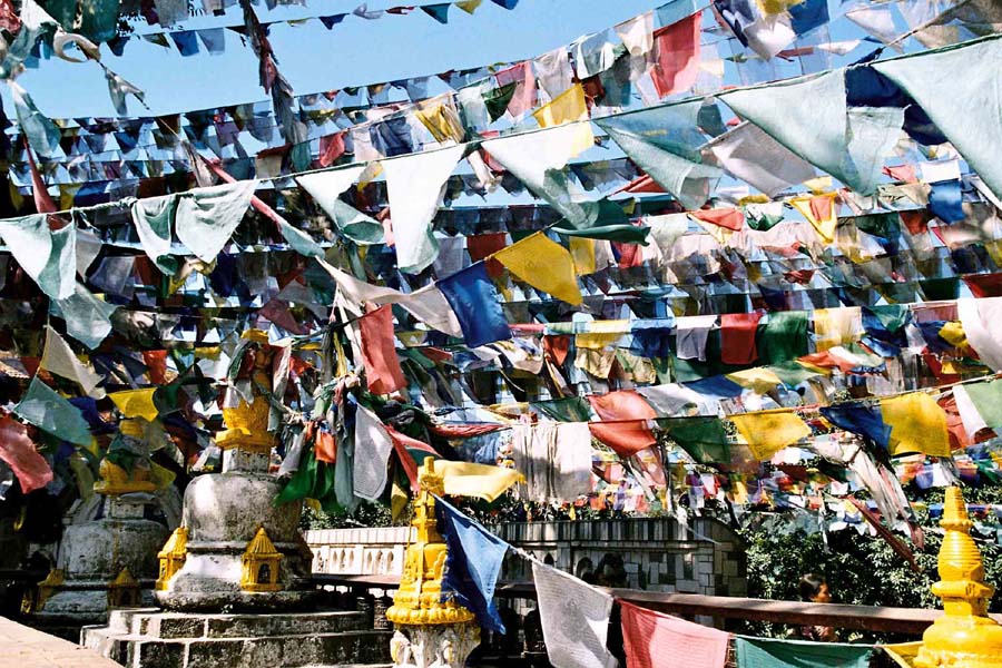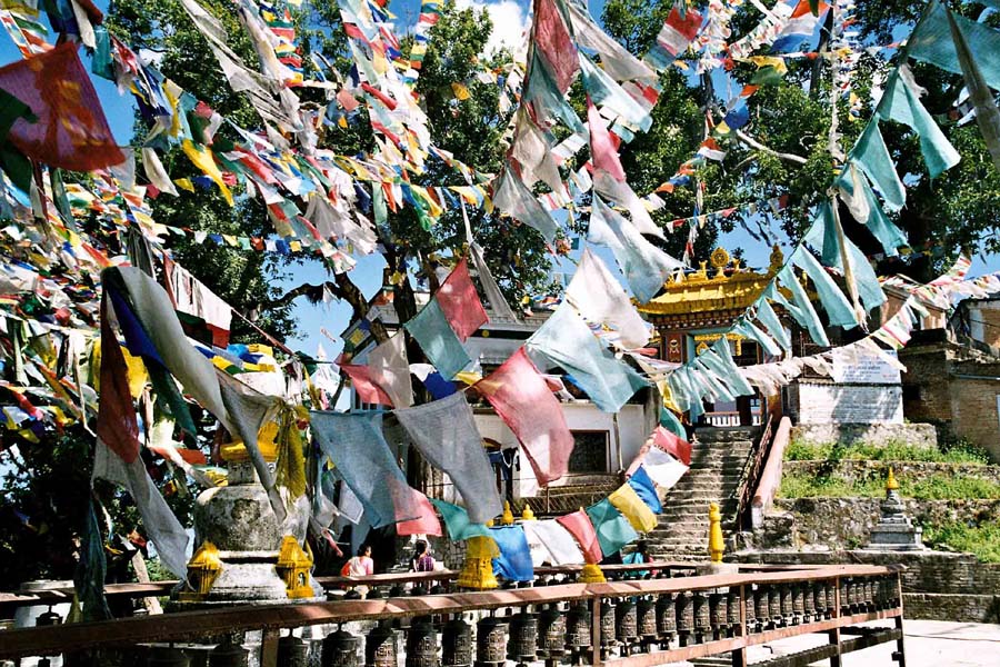 Gebetsmühle und unzählige bunte Gebetsfahnen, die im Wind flattern, begrüßen
