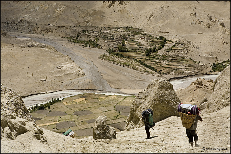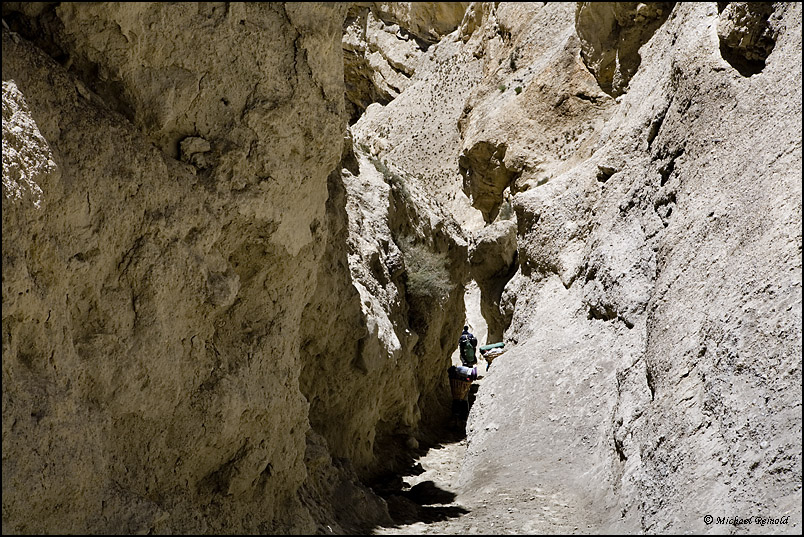 eine enge Schlucht herunter nach Dri (3400 m) auf uns. Zum Glück werden wir noch