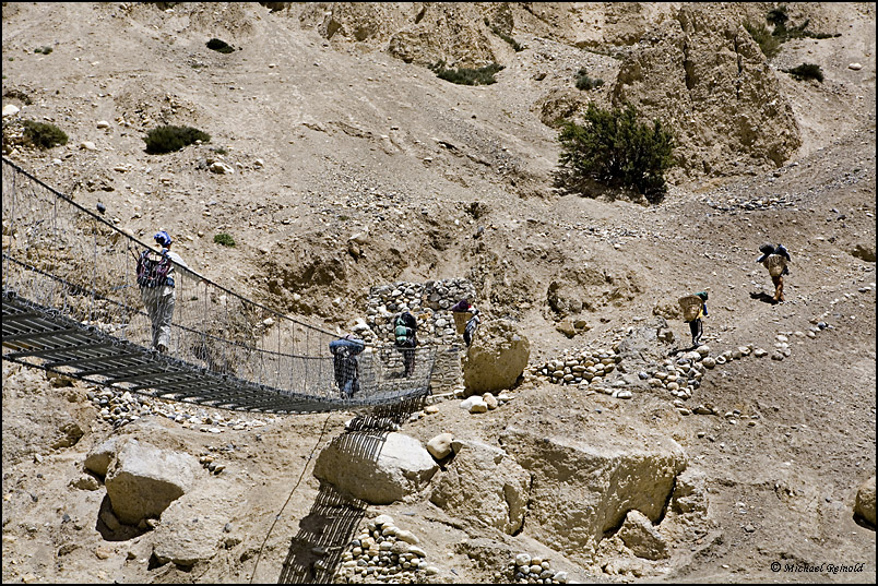 Hängebrücke auf die andere Seite des Mustang Kholas, danach leicht bergan und